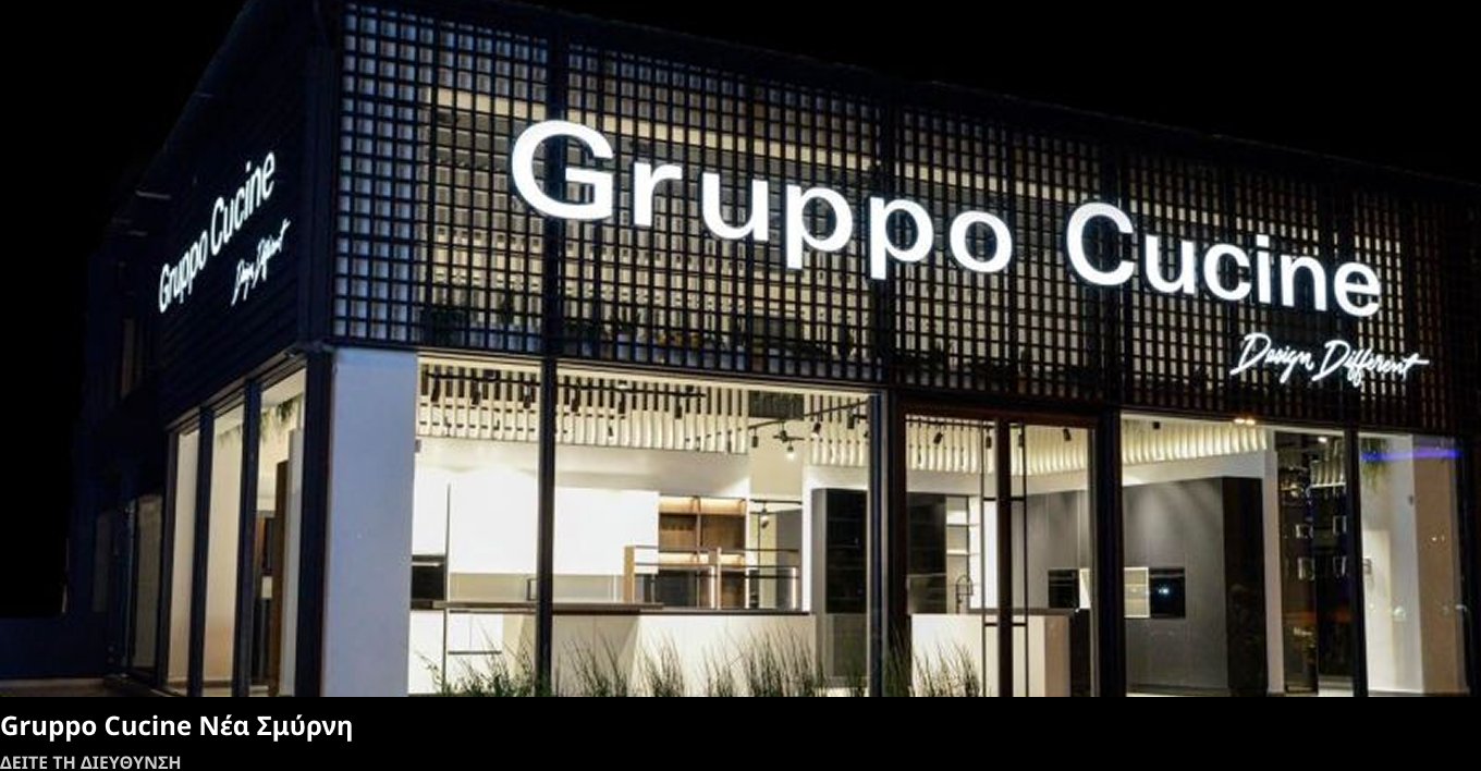 Το νέο κατάστημα στον αριθμό 151 της Λεωφόρου Α.Συγγρού στη Νέα Σμύρνη, αποτελεί το τελευταίο μέλος της «οικογένειας» Gruppo Cucine. Σε ένα χώρο 180m2 φιλοξενεί όλα τα τελευταία επιτεύγματα των συνεργαζόμενων με την εταιρεία brands, προσφέροντας στους επισκέπτες τη δυνατότητα να γνωρίσει όλες τις τελευταίες τεχνολογικές εξελίξεις στο χώρο των επίπλων κουζίνας και ντουλάπας.