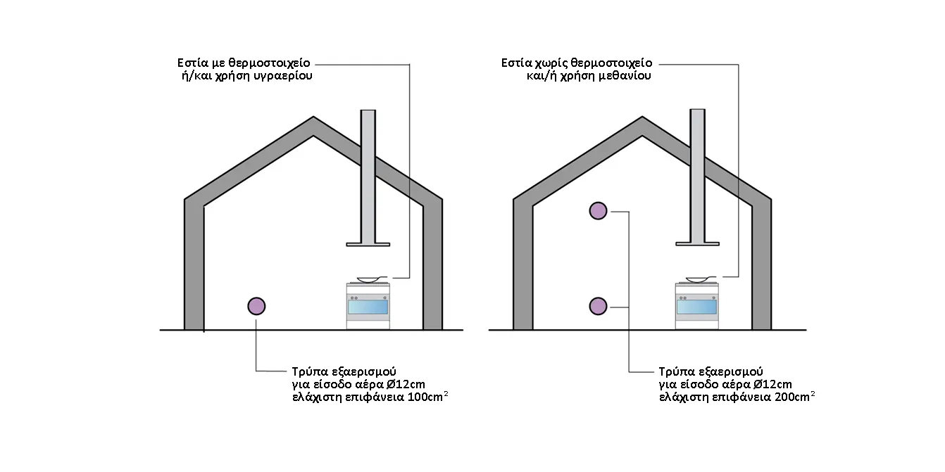 - Σε εστίες αερίου, που δε διαθέτουν θερμοστοιχείο (βαλβίδα που σταματά τη ροή του αερίου αν η φλόγα σβήσει), χρειάζεται μια επιπλέον οπή για να επιτευχθεί ελάχιστη διατομή εξαερισμού 200cm.