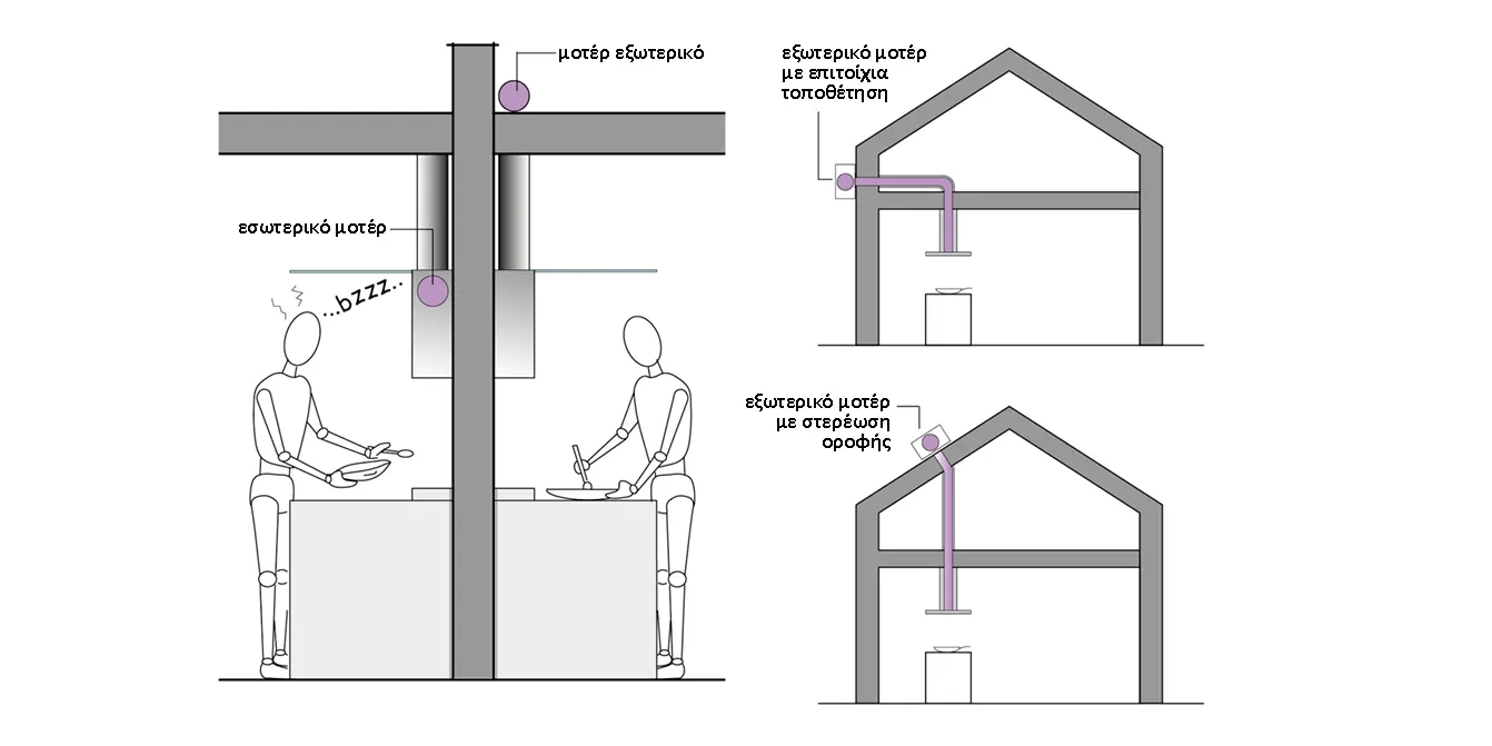 Το μοτέρ μπορεί να είναι τοποθετημένο μέσα στον απορροφητήρα. Σε αυτή την περίπτωση, για να μειωθεί το επίπεδο θορύβου, πρέπει το μοτέρ να είναι υψηλής ποιότητας. Αν θέλετε να μειώσετε περαιτέρω το θόρυβο, μπορείτε να τοποθετήσετε ένα απομακρυσμένο μοτέρ εξωτερικά, φροντίζοντας να εγκαταστήσετε έναν αγωγό που επιτρέπει την ομαλή ροή του αέρα, χωρίς στροβιλισμούς (οι οποίοι είναι ιδιαίτερα θορυβώδεις).