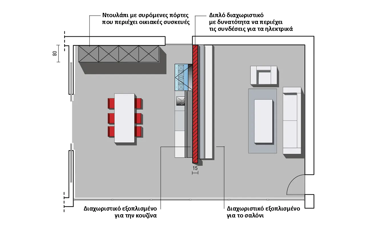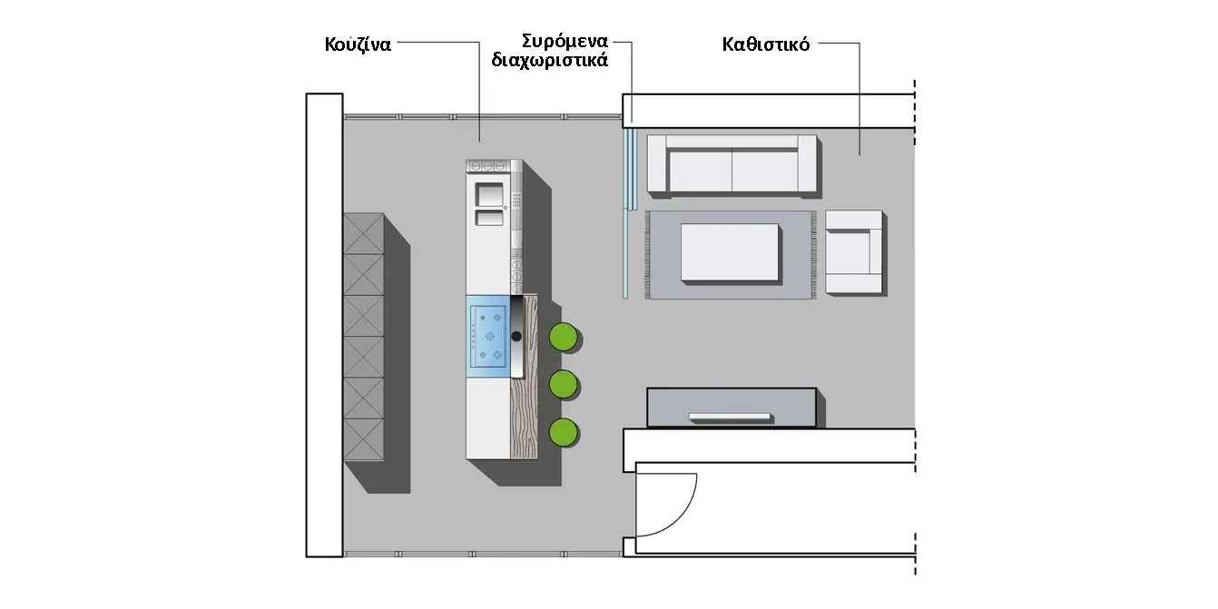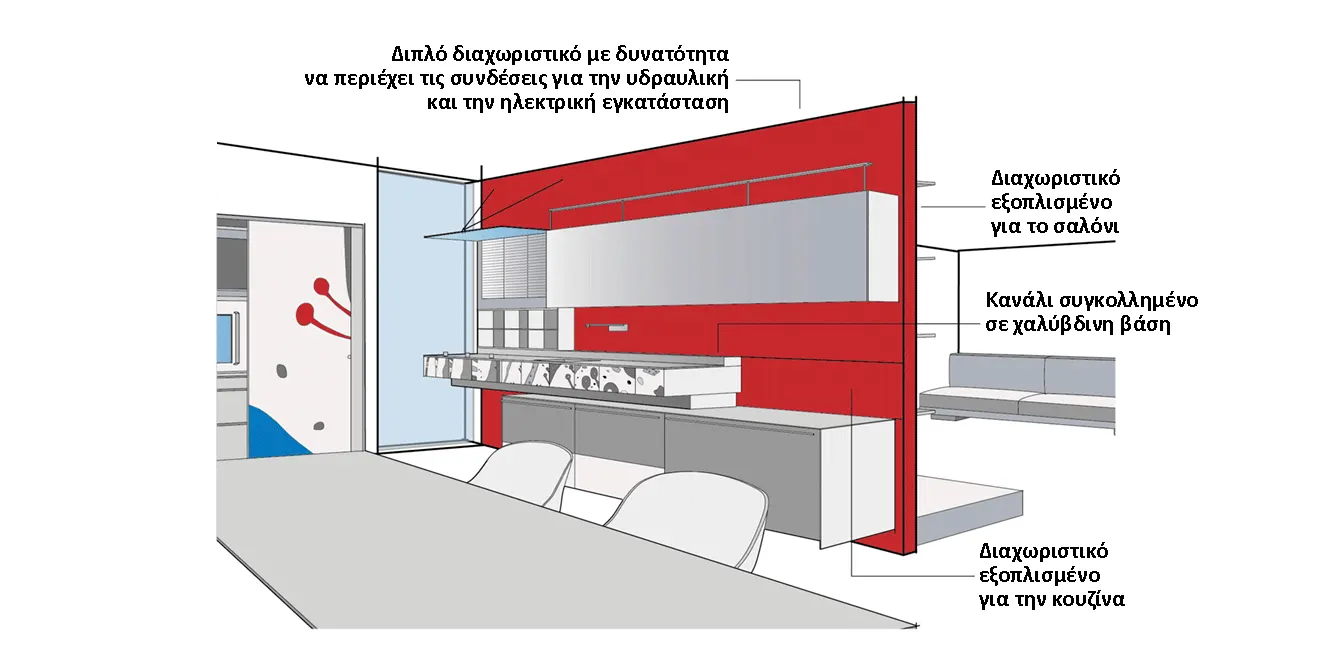 - Αρθρωτά διαχωριστικά, που χωρίζουν την κουζίνα από το καθιστικό και μπορούν να είναι διαφανή (συρόμενα ή σταθερά) ή πλήρη (πάνελ τοίχου).