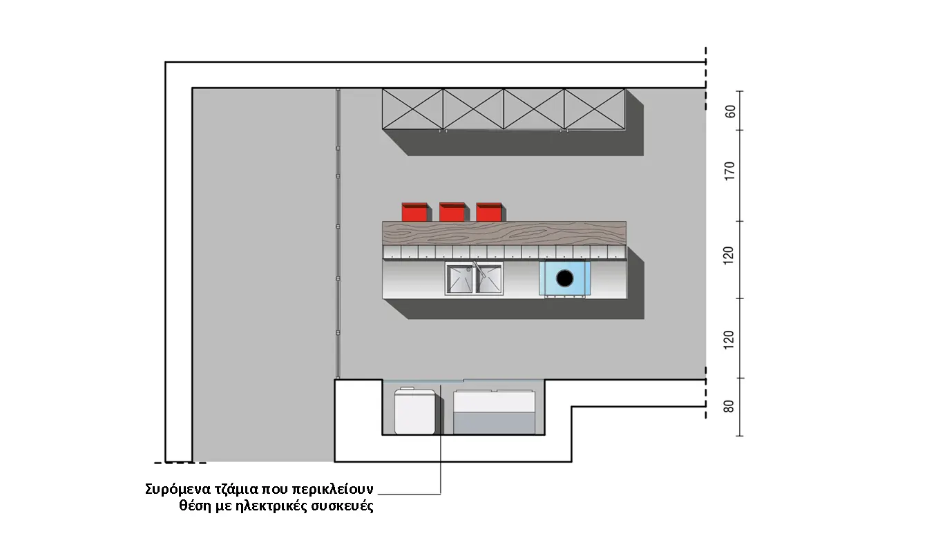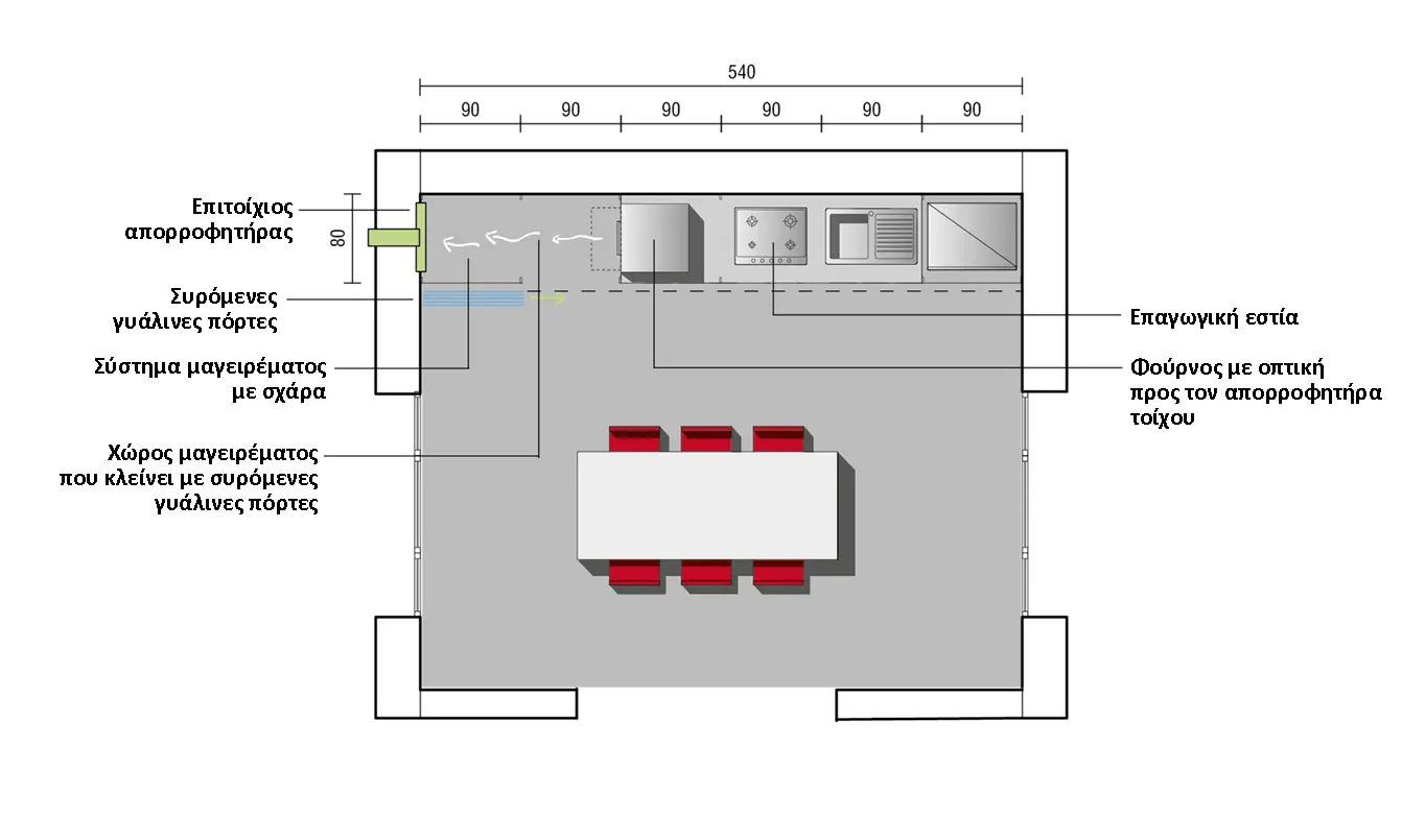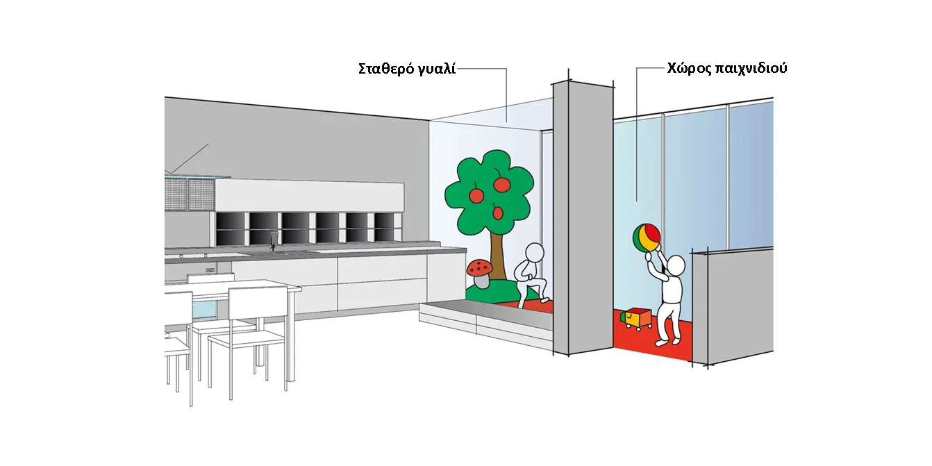 - Συρόμενες γυάλινες πλάκες, για να περικλείουν την περιοχή όπου μαγειρεύουμε.