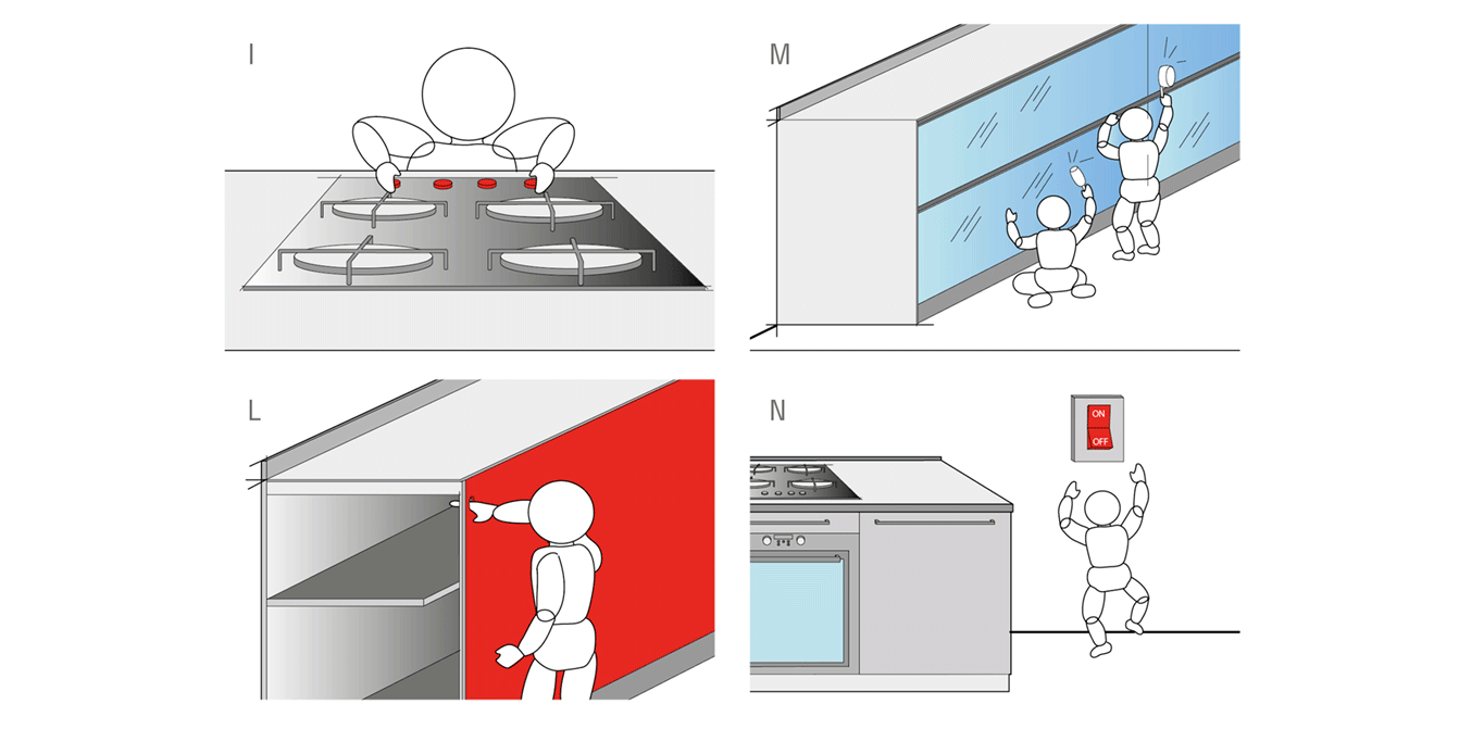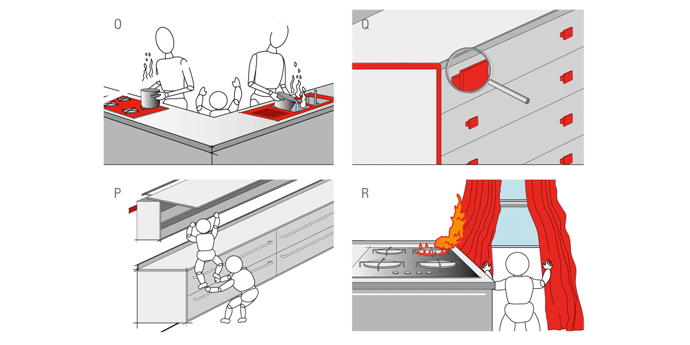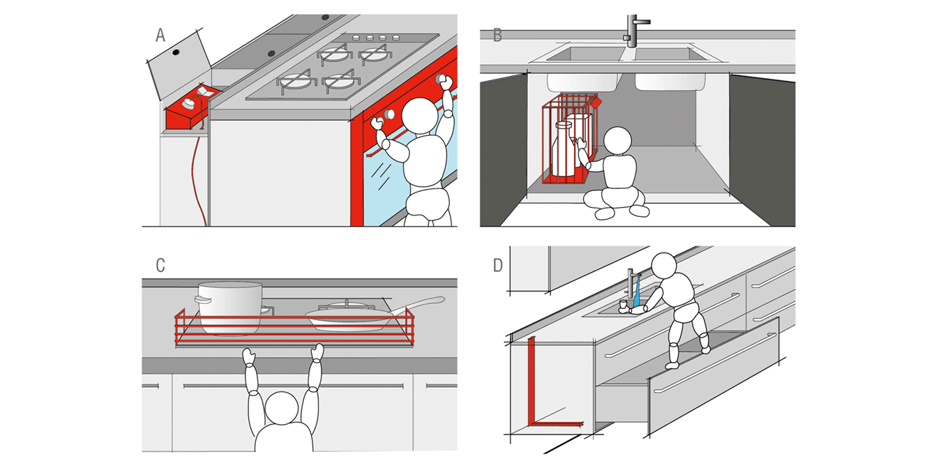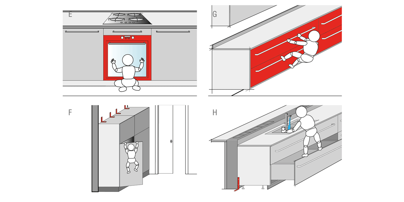 D – Μερικές φορές, τα παιδιά έλκονται από αντικείμενα που βρίσκονται πάνω στον πάγκο εργασίας, με αποτέλεσμα να ανεβαίνουν στις λαβές και στα συρτάρια για να τα φτάσουν. Για να αποφευχθεί κάποιο ατύχημα, είναι σημαντικό τα έπιπλα κουζίνας που είναι κρεμασμένα στον τοίχο να διαθέτουν ένα ασφαλές και στιβαρό σύστημα τοποθέτησης, εξασφαλίζοντας ότι δε θα υποχωρήσουν υπό πίεση.