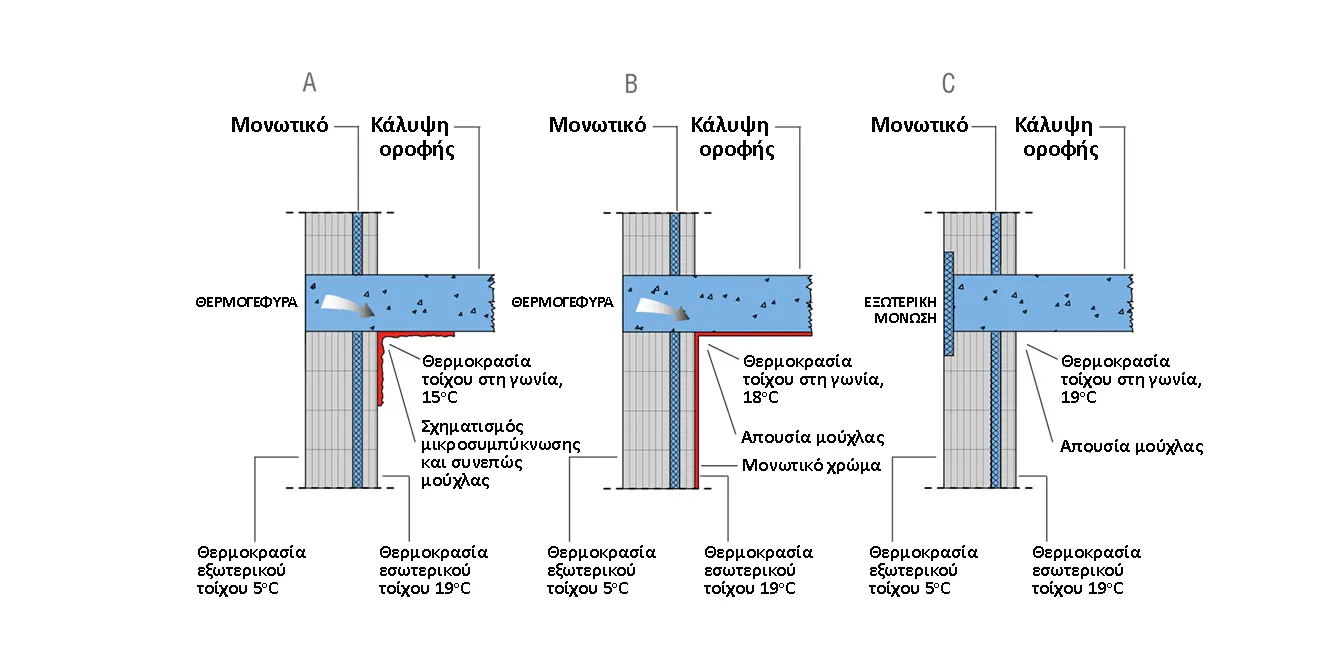 B – Υπάρχουν ειδικά μονωτικά χρώματα, διαθέσιμα στην αγορά, που αποτρέπουν την πτώση της θερμοκρασίας λόγω της θερμικής γέφυρας στην οροφή, εμποδίζοντας έτσι την εμφάνιση μούχλας.
