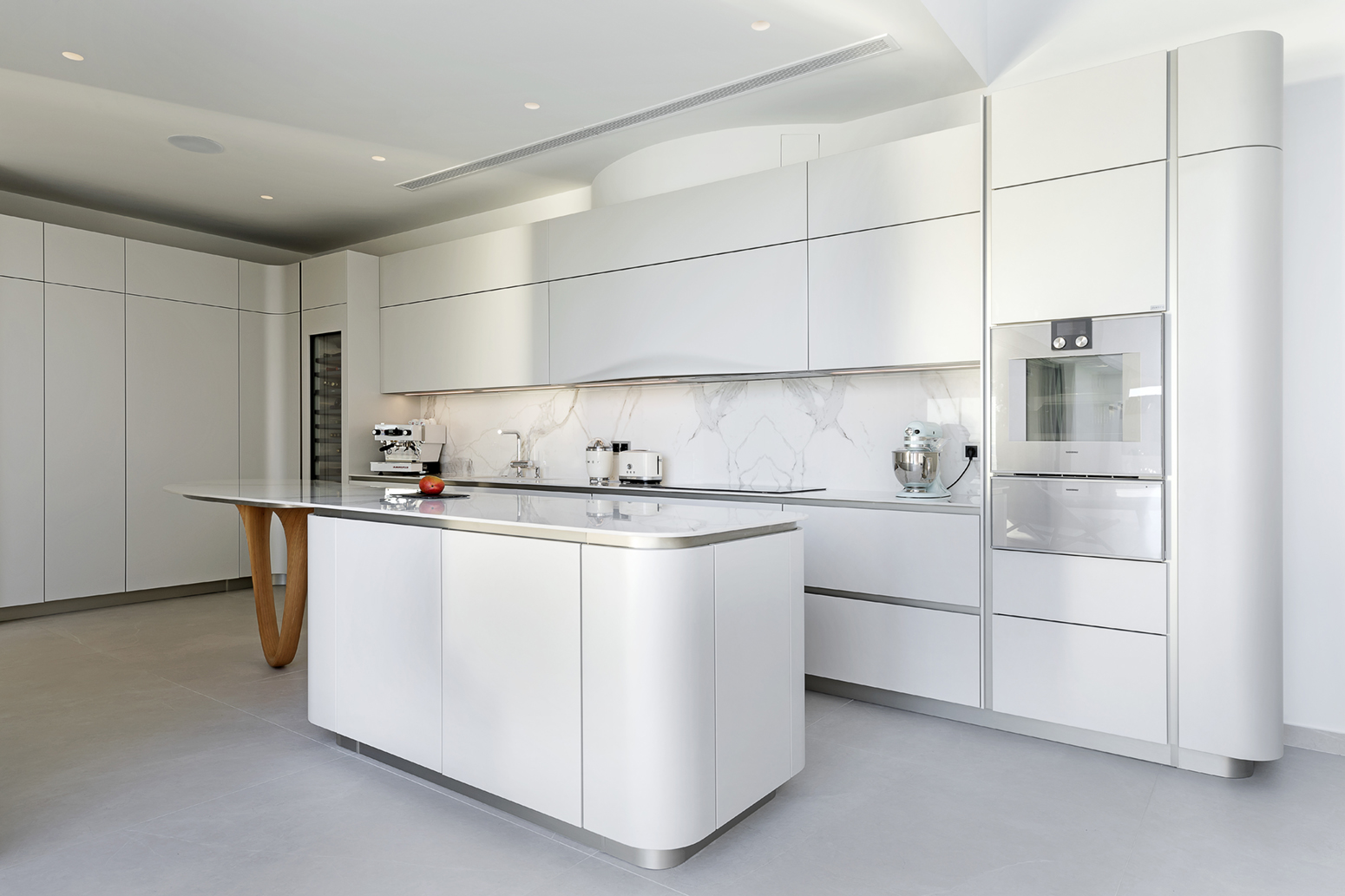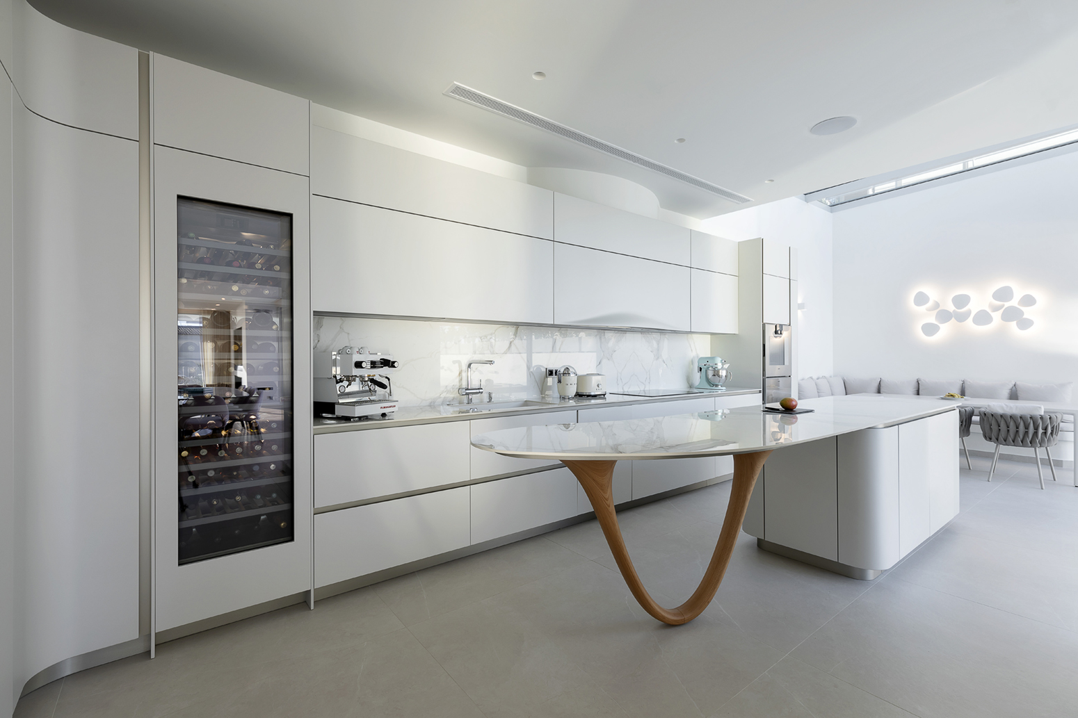 Η σχεδιαστική συμμετρία, οι καμπύλες επιφάνειες και οι λεπτομέρειες στον απορροφητήρα δημιουργούν ένα μοναδικό αισθητικό αποτύπωμα, απόλυτα προσαρμοσμένο στις ανάγκες των κατοίκων. Η ομάδα της Gruppo Cucine παρέδωσε έναν χώρο που συνδυάζει υψηλή αισθητική, πρακτική εργονομία και προσωποποιημένη λειτουργικότητα, χωρίς περιττές υπερβολές.