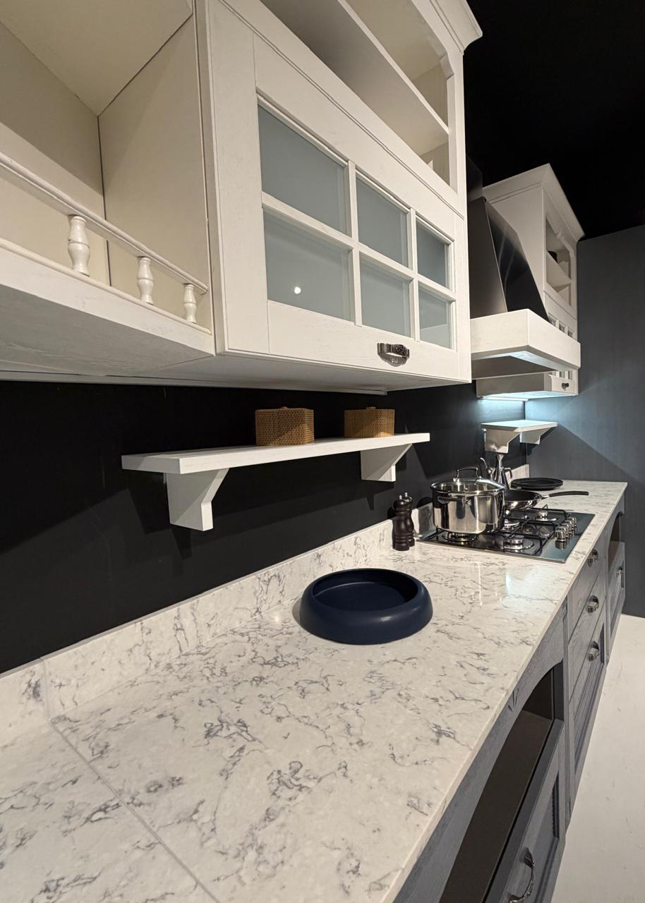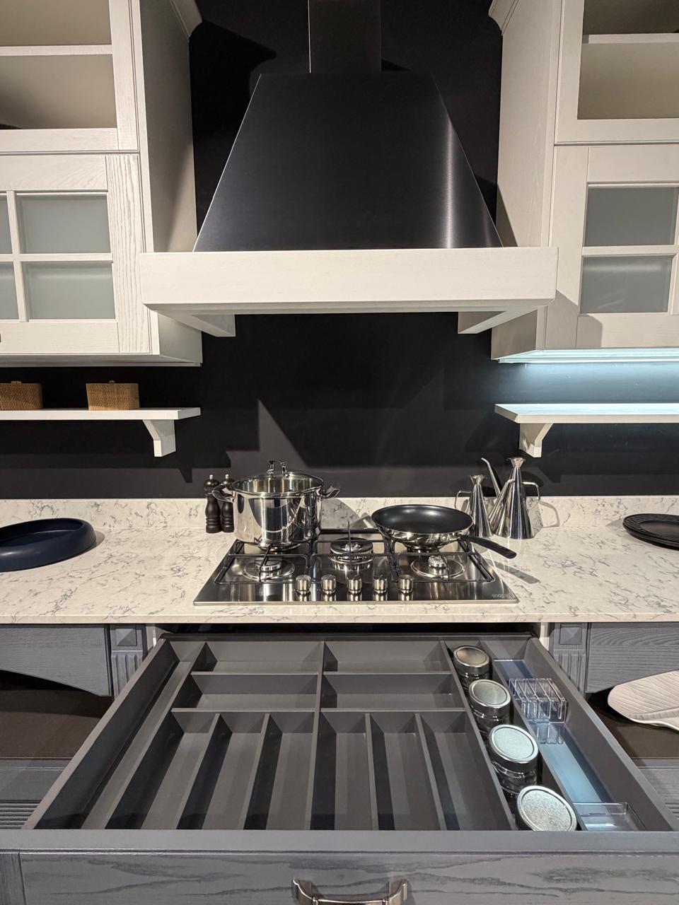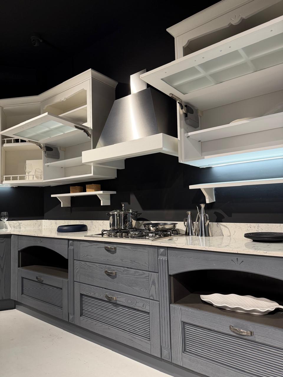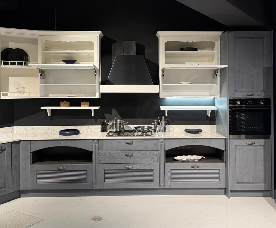 Το εκθεσιακό μοντέλο AISHA XA αποτελείται από μια γωνιακή σύνθεση που δημιουργούν ένα σύνολο με μεγάλο αποθηκευτικό χώρο. Οι ηλεκτρικές συσκευές πωλούνται με επιπλέον αξία 1.000€.
