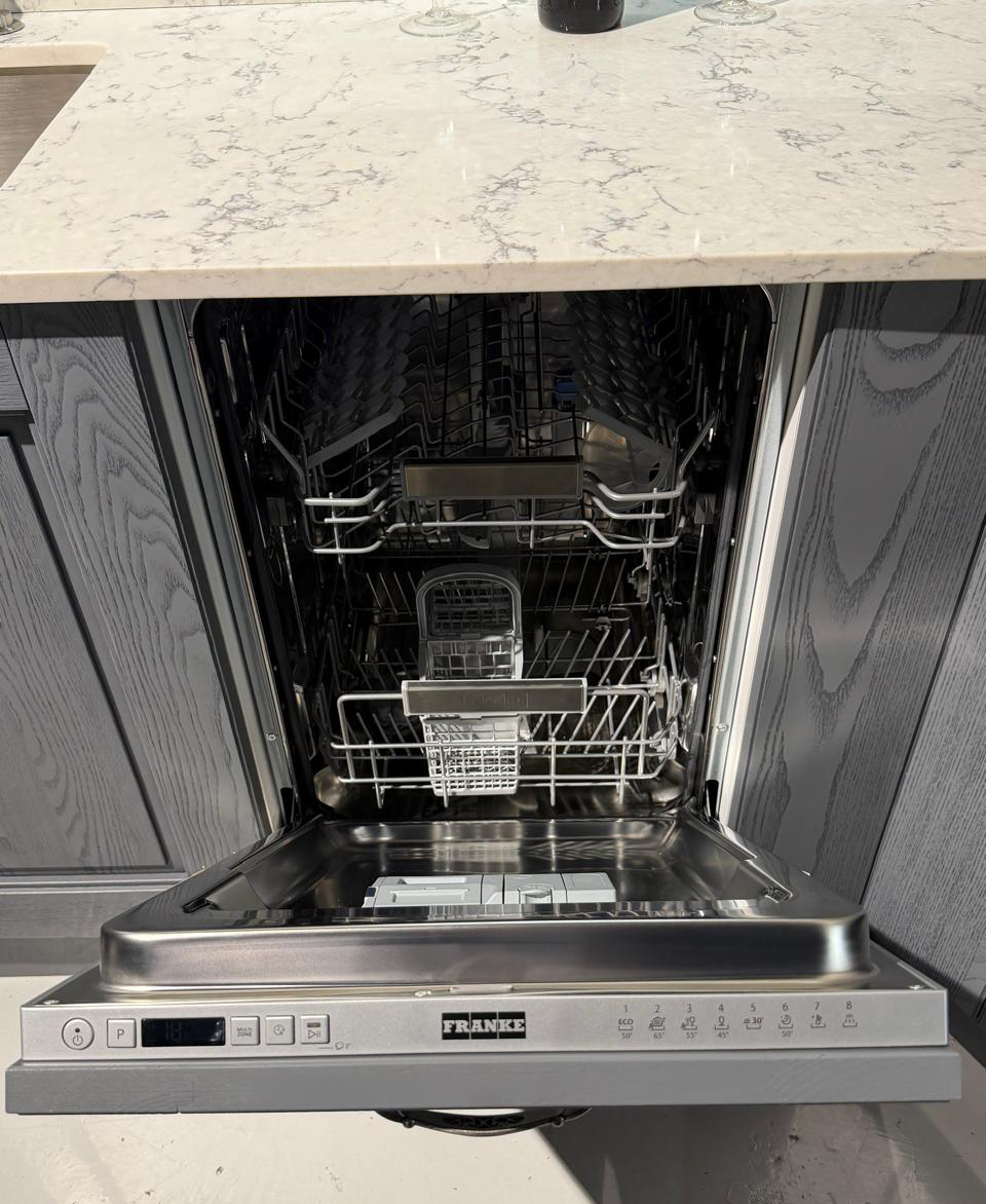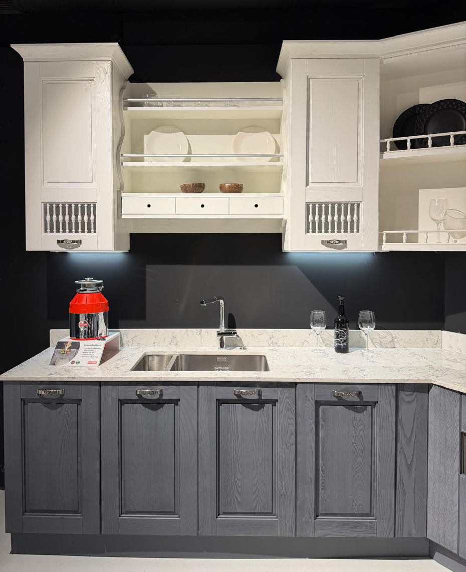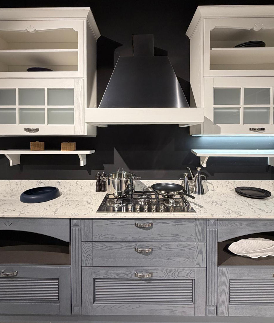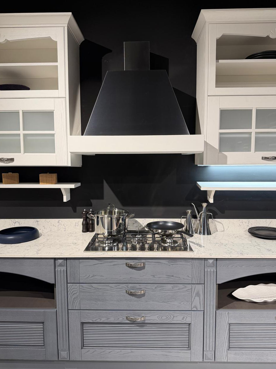 Το εκθεσιακό μοντέλο AISHA XA αποτελείται από μια γωνιακή σύνθεση που δημιουργούν ένα σύνολο με μεγάλο αποθηκευτικό χώρο. Οι ηλεκτρικές συσκευές πωλούνται με επιπλέον αξία 1.000€.