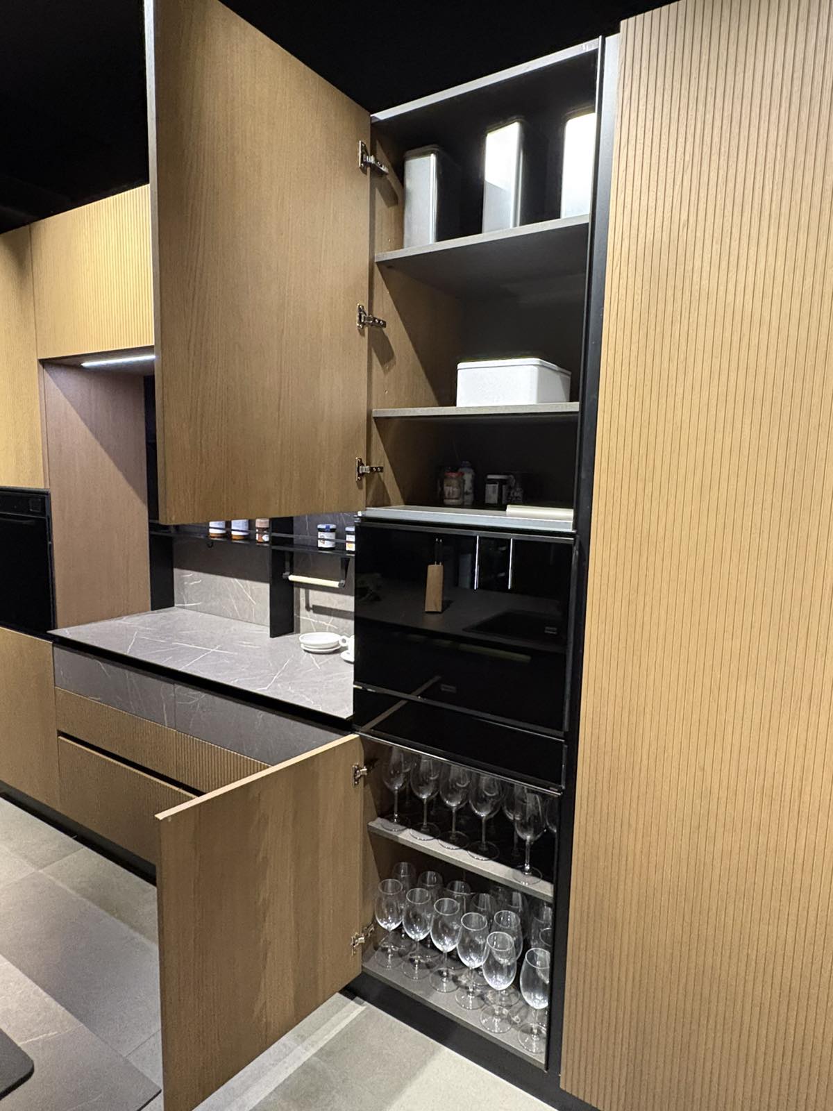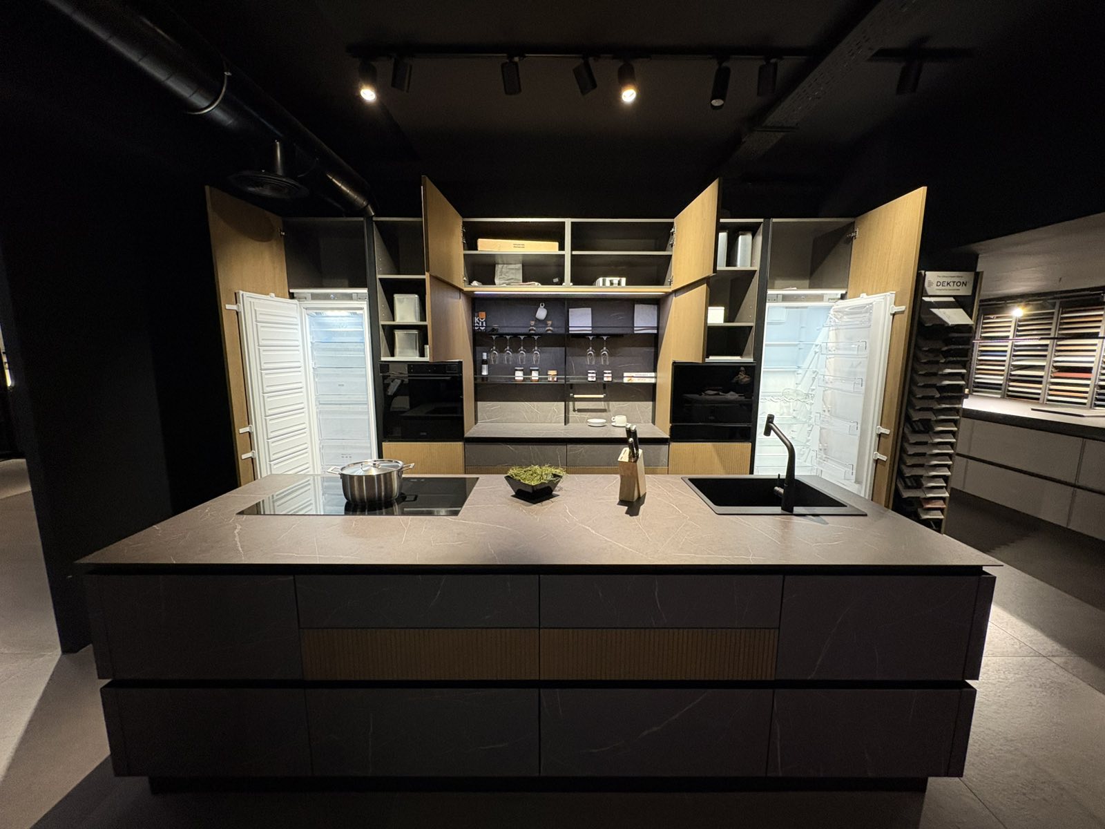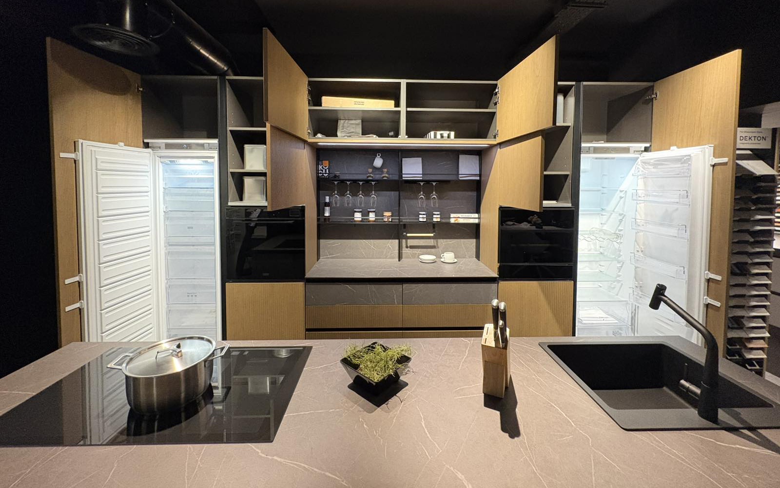 Το εκθεσιακό μοντέλο CORINZIA XA αποτελείται από τη νησίδα, και μια σύνθεση που δημιουργούν ένα σύνολο με μεγάλο αποθηκευτικό χώρο το οποίο μπορεί να ενσωματωθεί και σε ενιαίους χώρους. Οι ηλεκτρικές συσκευές πωλούνται με επιπλέον αξία 1.000€.