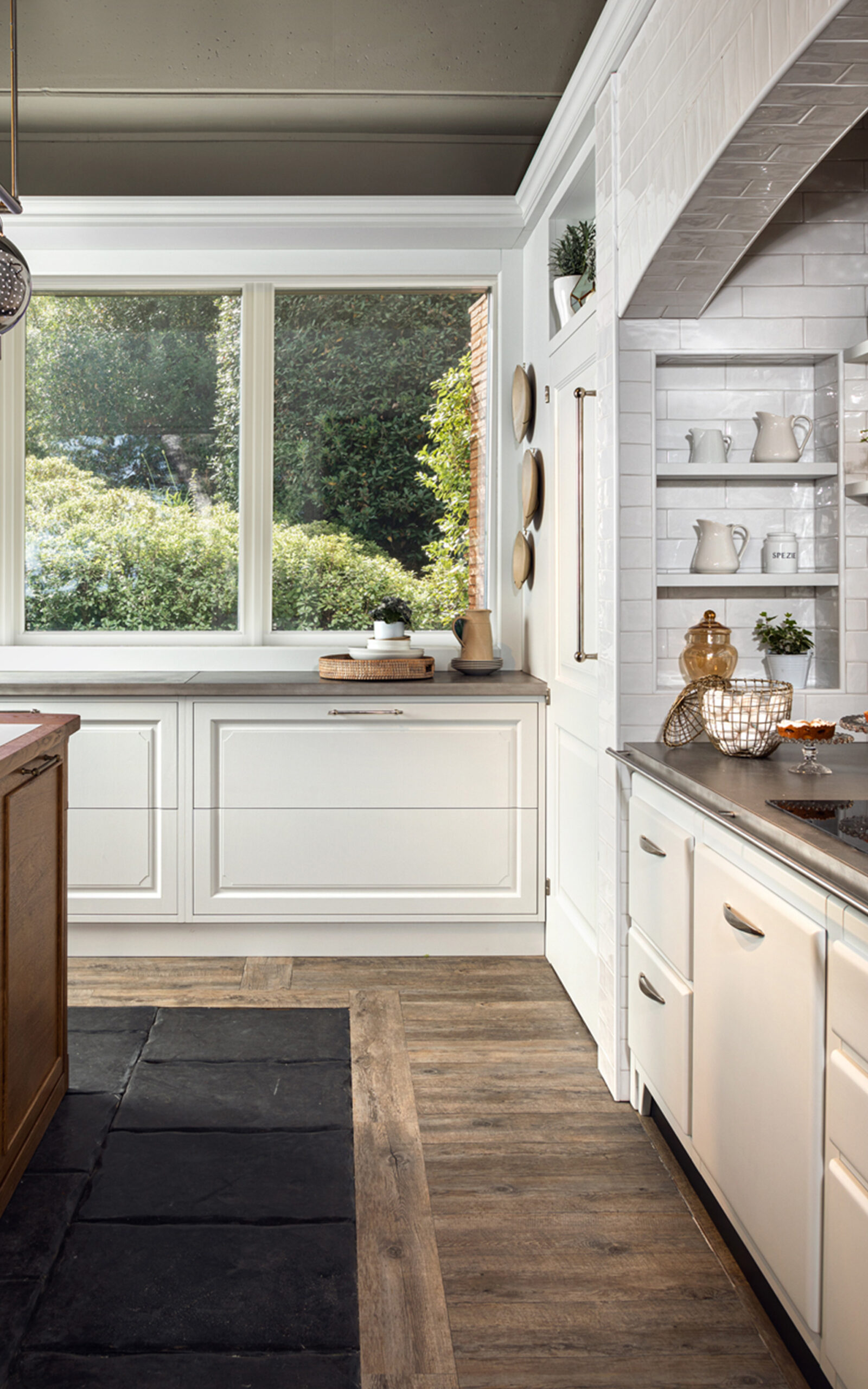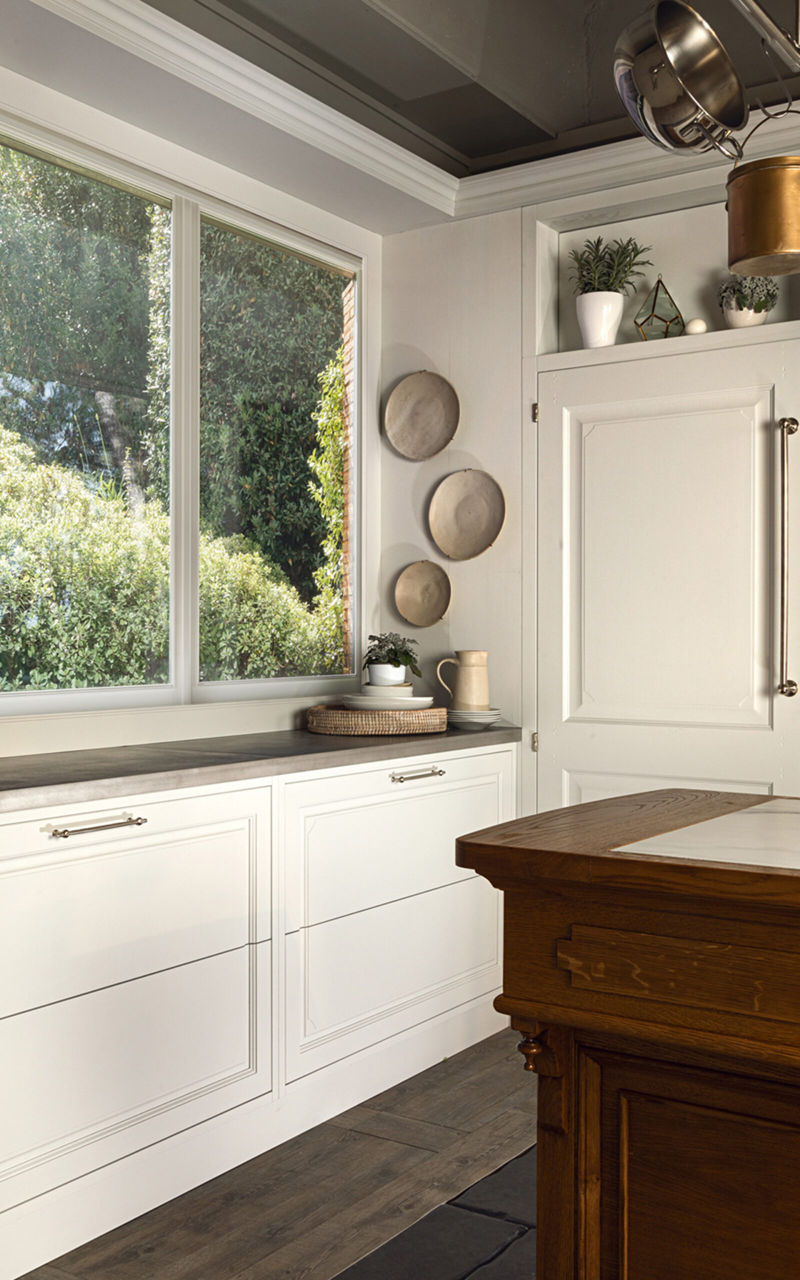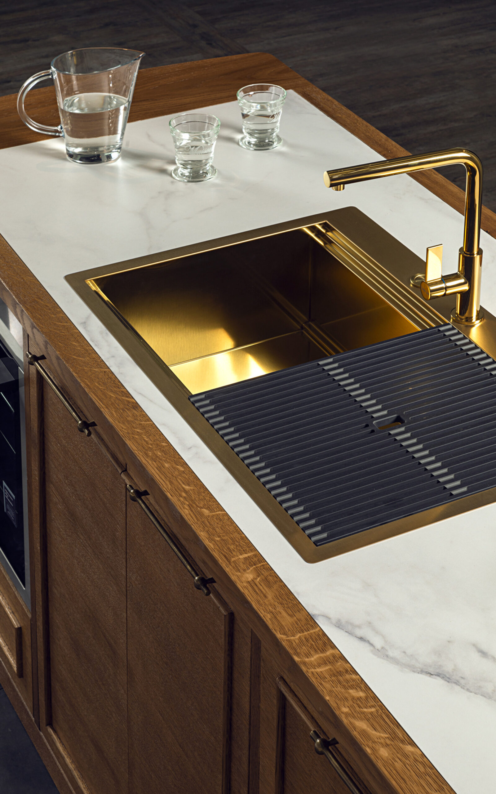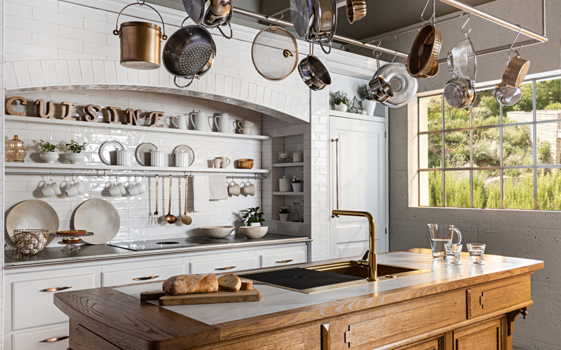 H Essenza συνδυάζει το vintage με το πραγματικά μοντέρνο design. Κύριο χαρακτηριστικό της είναι το δεξιοτεχνικό παιχνίδι μεταξύ υφών και υλικών. Κάσωμα από χάλυβα, ζεστό ξύλο με φυσικό φινίρισμα και διακριτική εκρού λάκα στα πορτάκια. Η μελί ξύλινη νησίδα μας θυμίζει παλιούς πάγκους καταστημάτων, διακοσμημένη από μασίφ ξύλο και ατσάλινο νεροχύτη με φινίρισμα από ορείχαλκο αντίκα. Η εκλεπτυσμένη απλότητά της, την κάνει μια πραγματικά διαχρονική κουζίνα.