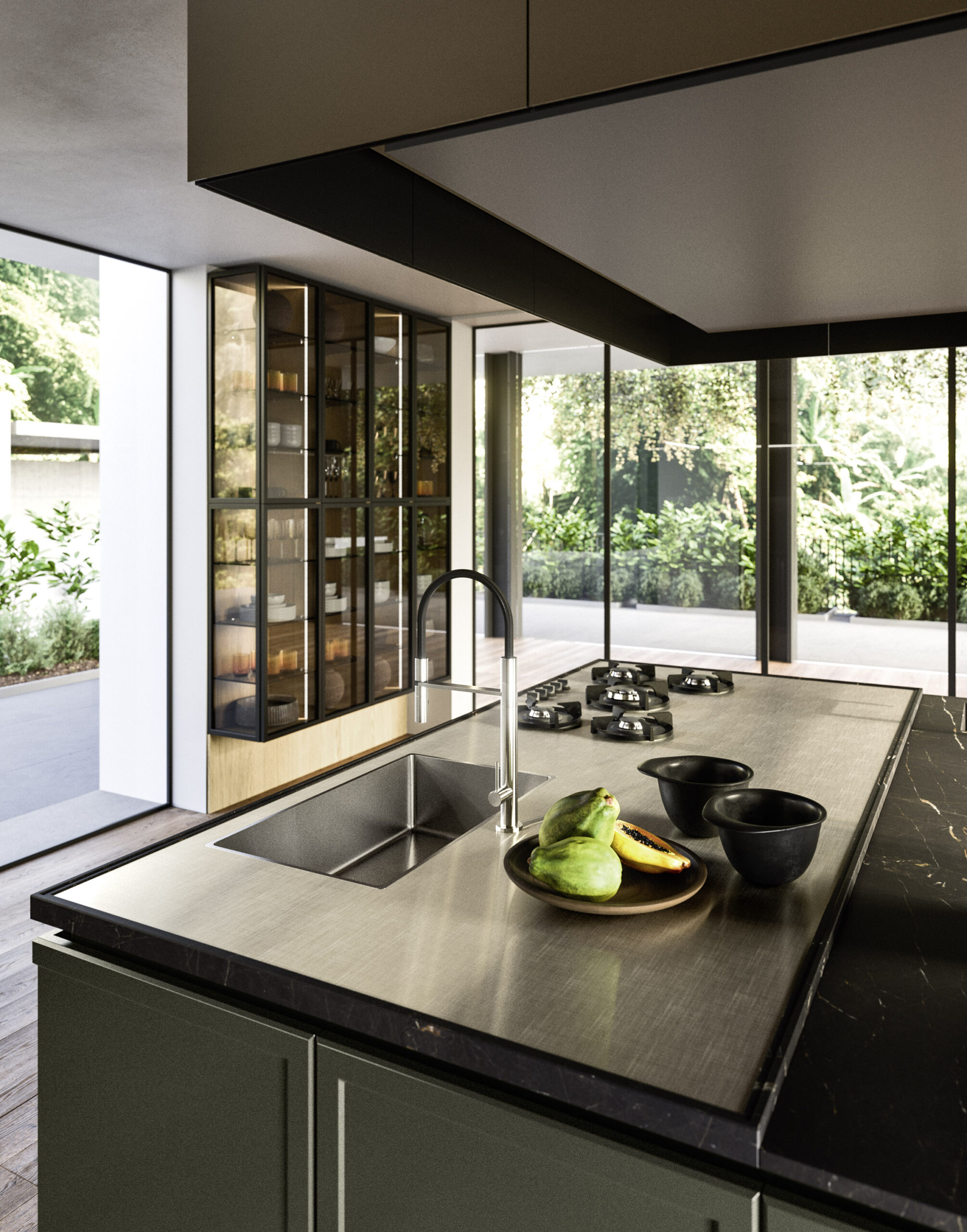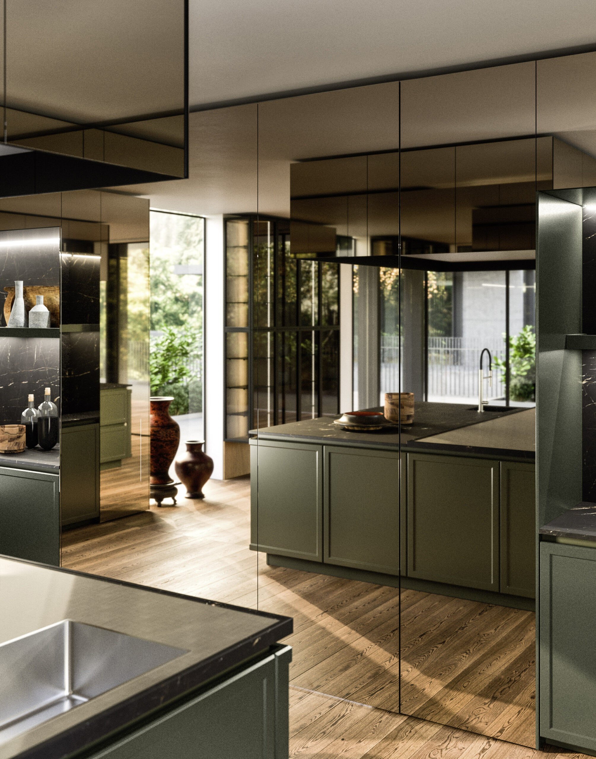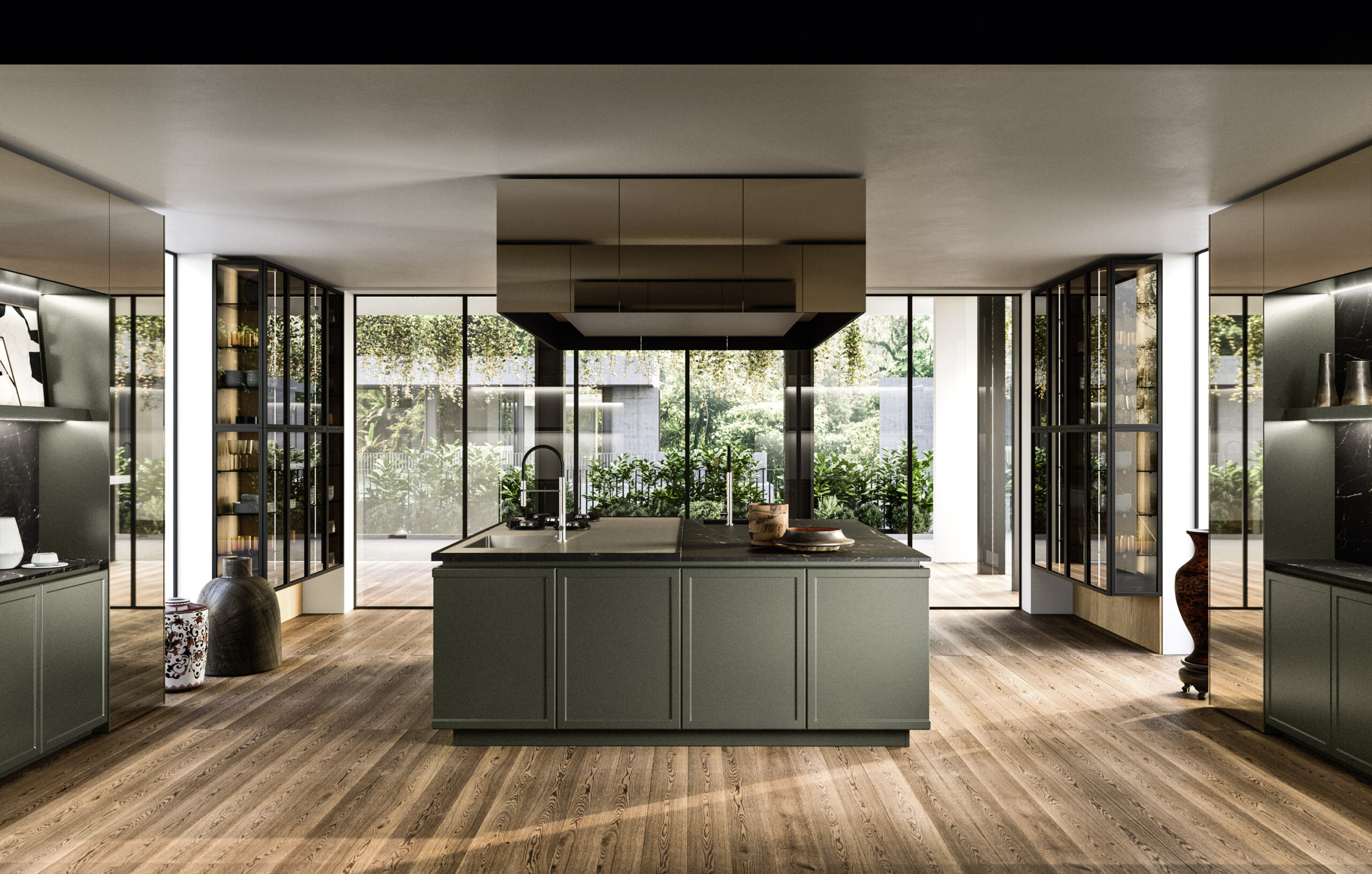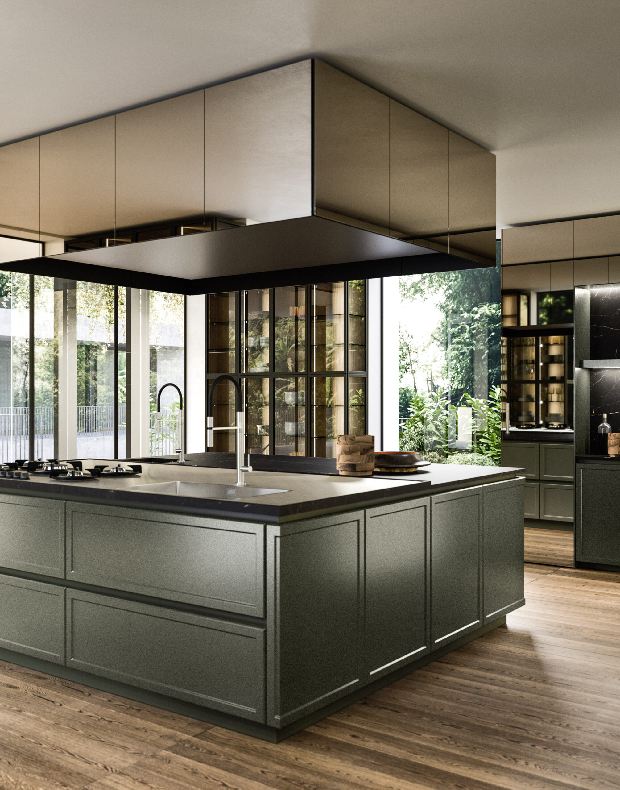 Εκλεπτυσμένη έκφραση μιας οικιακής εικόνας με κλασική έμπνευση αλλά με βιομηχανικές chic επιρροές. Ένα σχέδιο με κλασικό πυρήνα, επανασχεδιασμένο με μια σύγχρονη προσέγγιση, που επιτυγχάνεται μέσω της πόρτας με πλαίσιο και το άνοιγμα με αυλάκι, η οποία αποπνέει μια καθαρή, κοφτερή σιλουέτα και διαχρονική γοητεία.