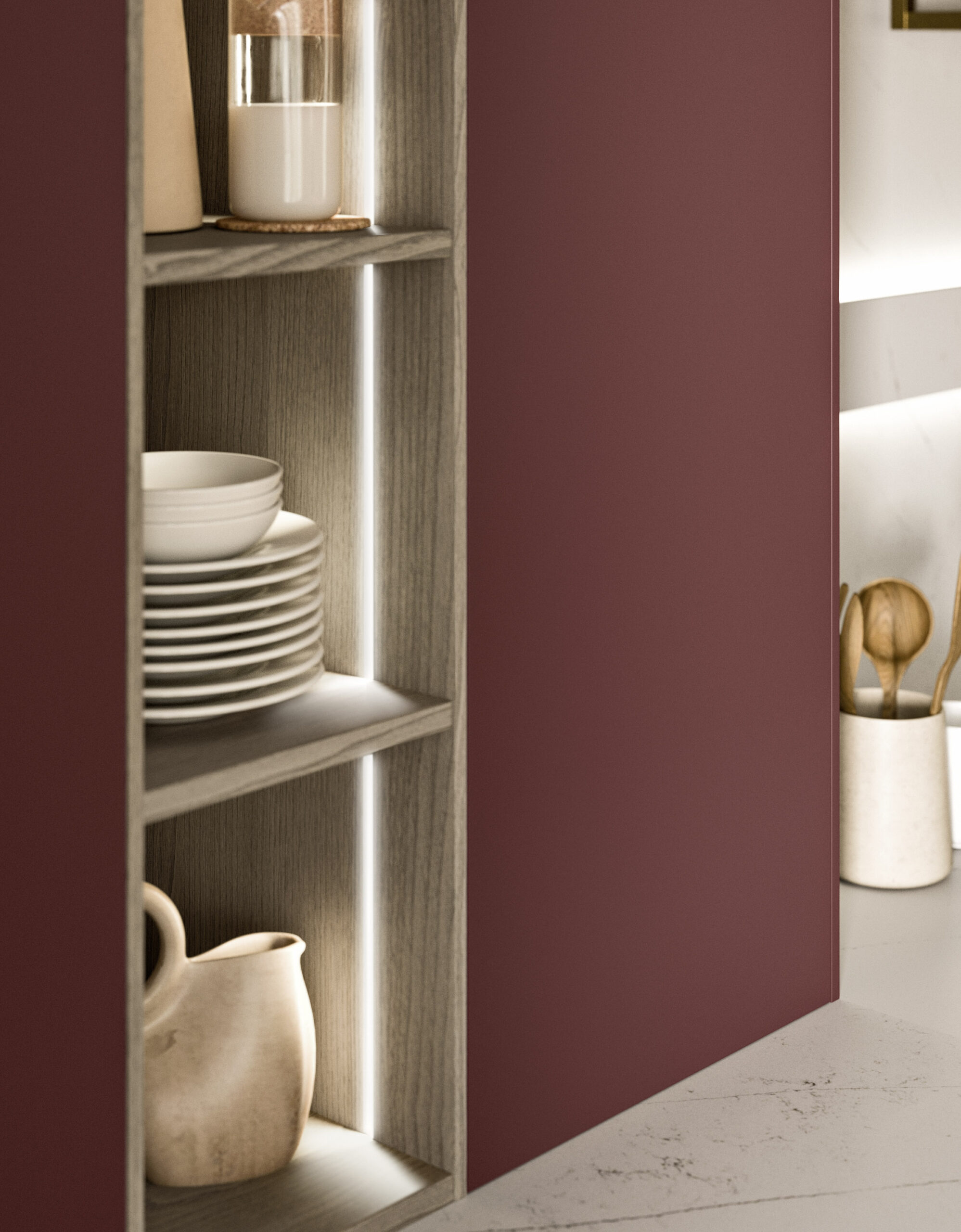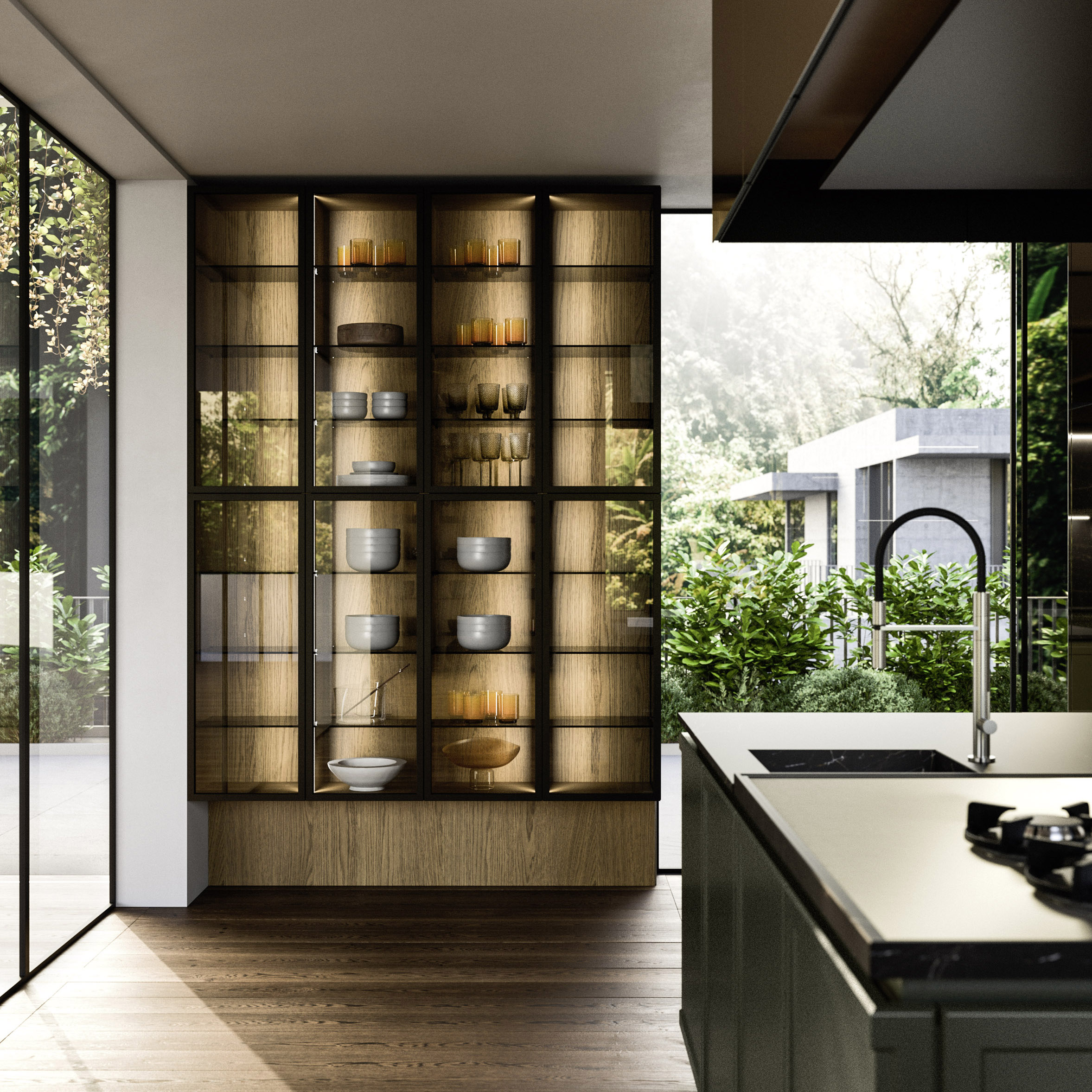 Περιλαμβάνει επίσης το κελάρι, μια κομψή μονάδα που αναδεικνύει φιάλες και ποτήρια. Η ευρεία γκάμα επιλογών εσωτερικής διαμόρφωσης, σε συνδυασμό με την εστιασμένη σχεδιαστική έρευνα στις λεπτομέρειες φινιρίσματος, καθιστούν τις λύσεις εντυπωσιακές, αναδεικνύοντας τον εξοπλισμό του εσωτερικού.