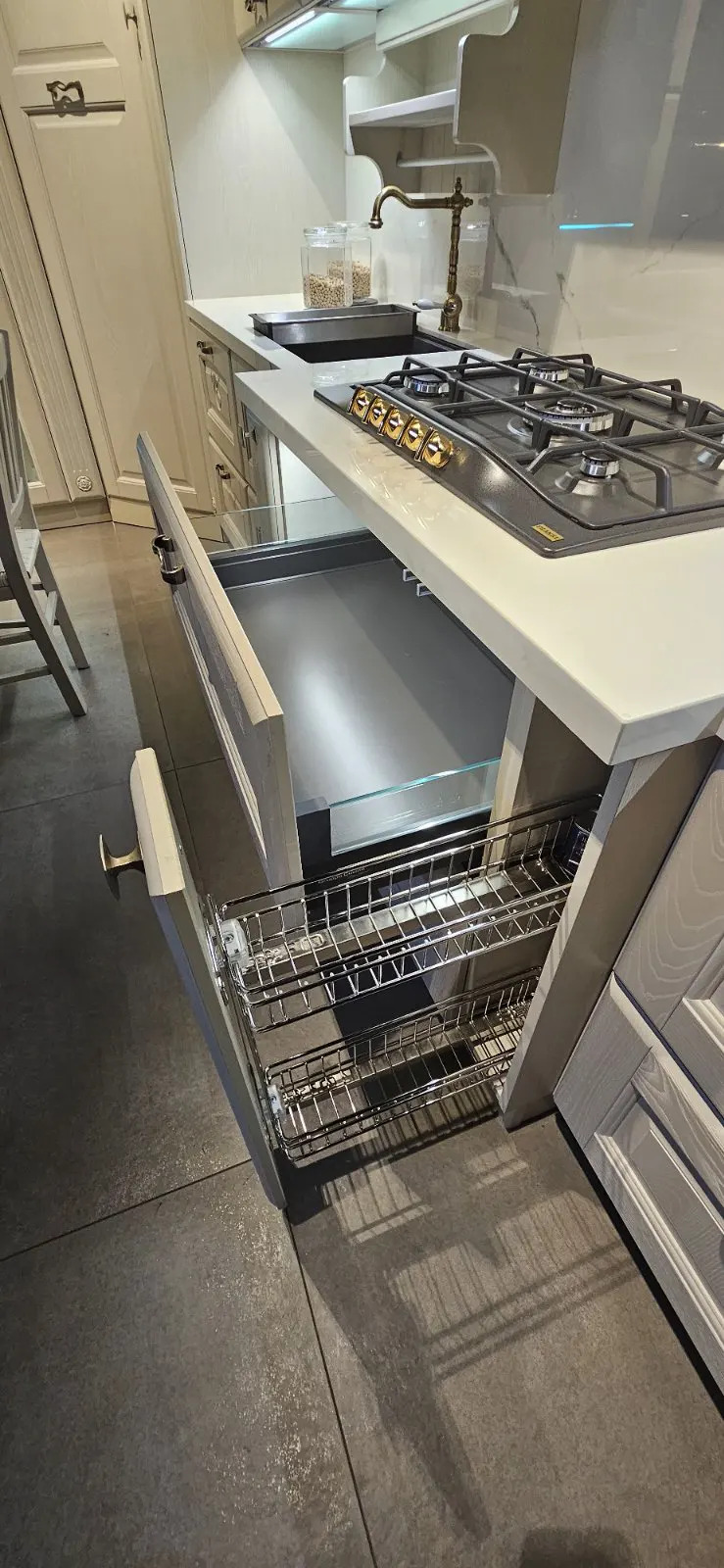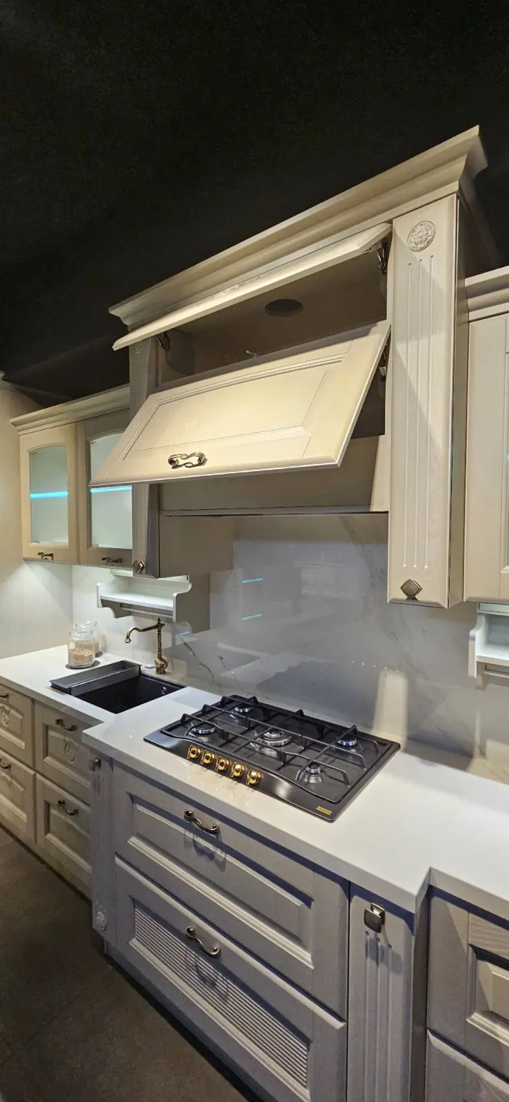 Το εκθεσιακό μοντέλο OLIMPIA είναι μια κλασική κουζίνα με τεράστιο αποθηκευτικό χώρο πολλούς μηχανισμούς, μεγάλη τροφοθήκη με ηλεκτρικό μηχανισμό, σκαλιστές λεπτομέρειες και τραπέζι με 6 καρέκλες. Στην τιμή δεν περιλαμβάνεται ο πάγκος.