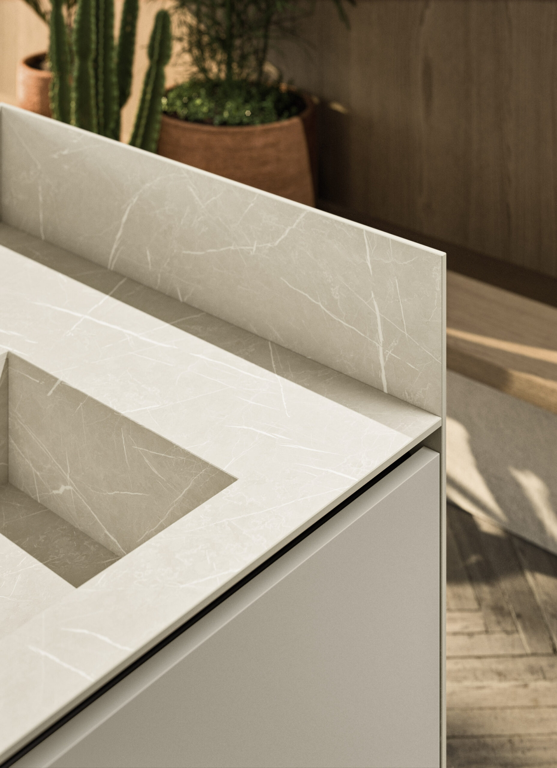 Ο λιτός, μινιμαλιστικός σχεδιασμός του εκφράζεται με την απουσία χερουλιού και το άνοιγμα των μετώπων μέσω ειδικής εσοχής.