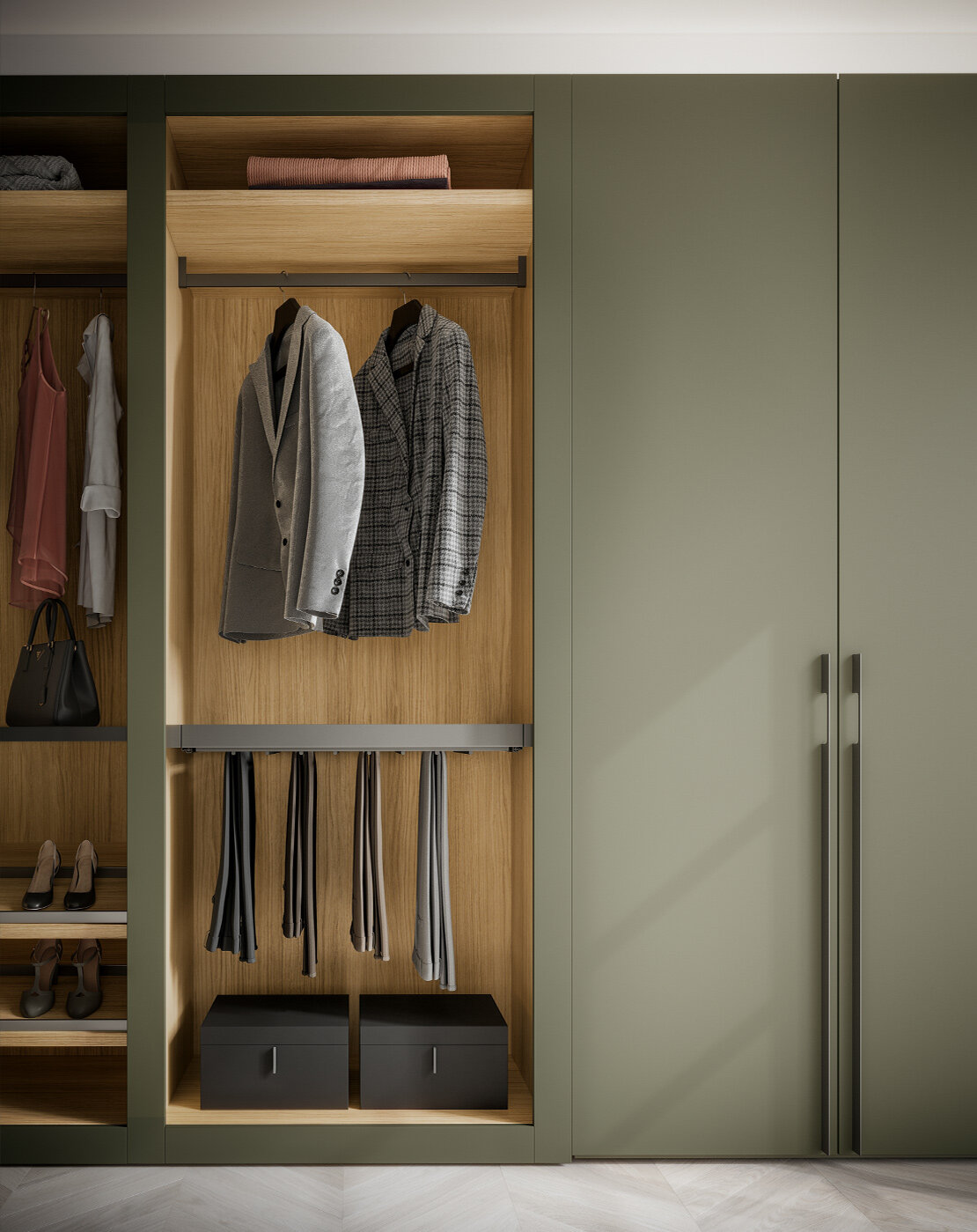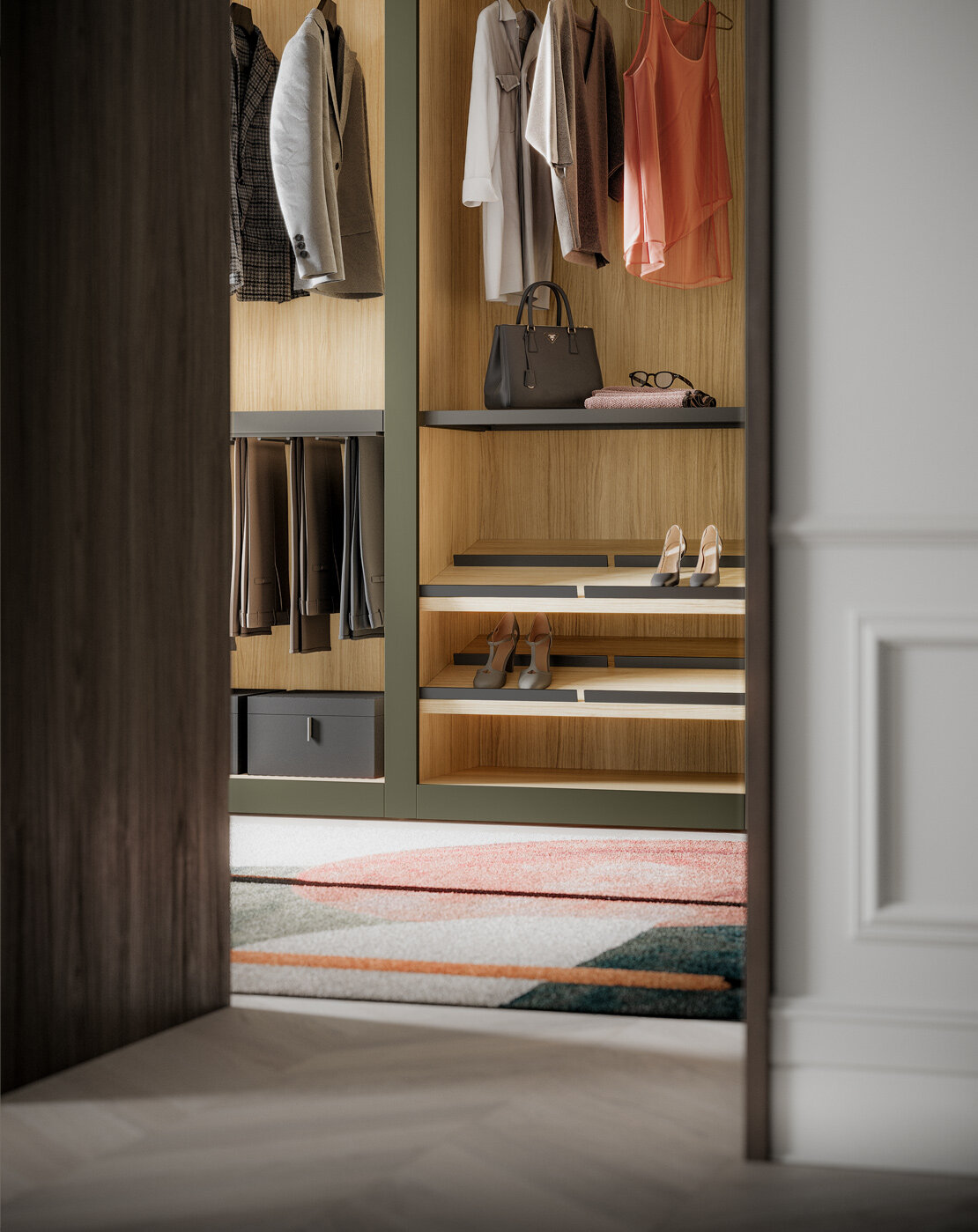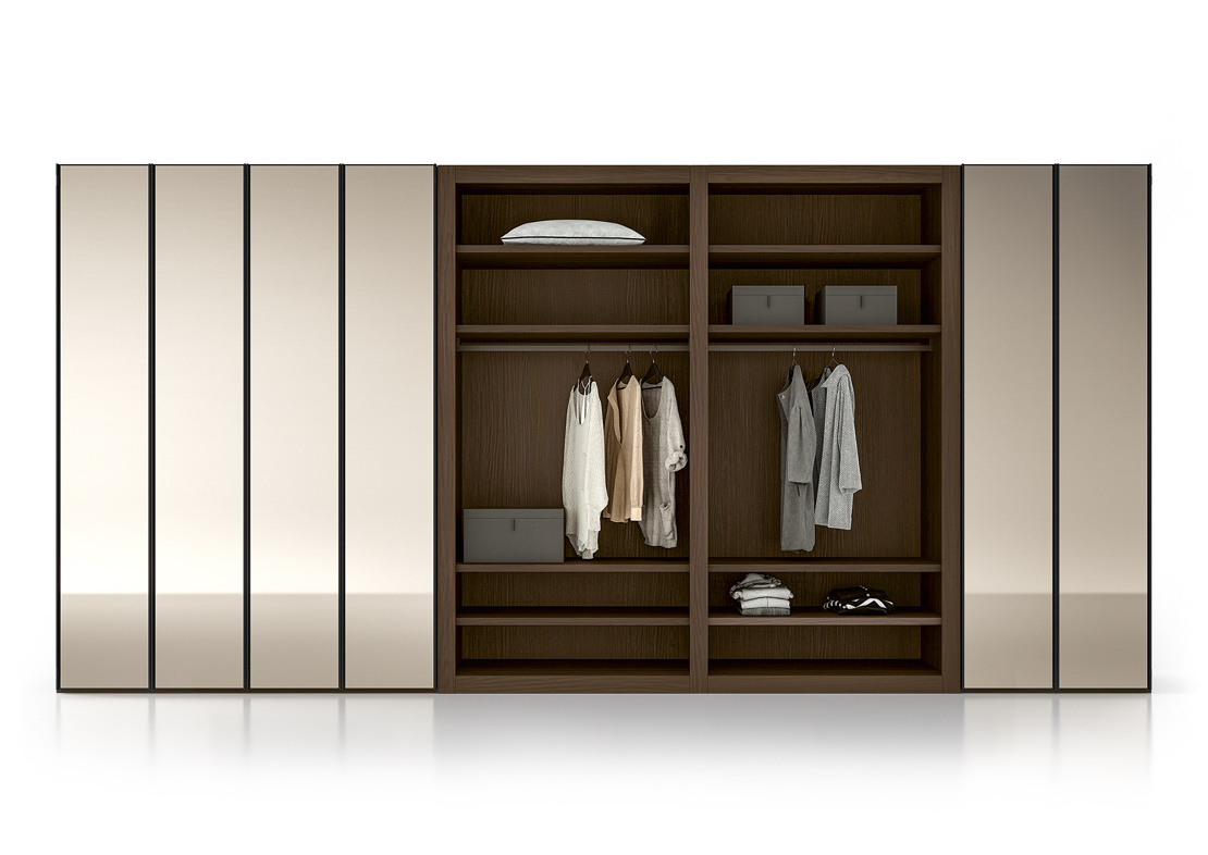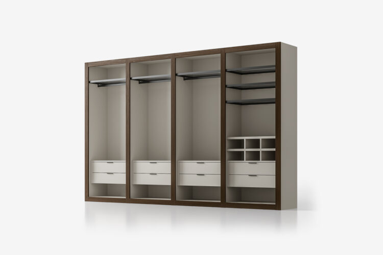 Ένα μοναδικό και πολυτελές βεστιάριο. Συνδυάστε το με το χρώμα των θυρών για ένα πραγματικά κομψό χρωματικό φινίρισμα με τις πόρτες Liscia, Ego ή Nocta. Ξύλινα ή γυάλινα ράφια, κεκλιμένες σχάρες παπουτσιών, συρόμενα αξεσουάρ και άλλος εξοπλισμός παρέχουν τέλειες λύσεις οργάνωσης και αποθήκευσης για κάθε εκατοστό χώρου στη γκαρνταρόμπα.