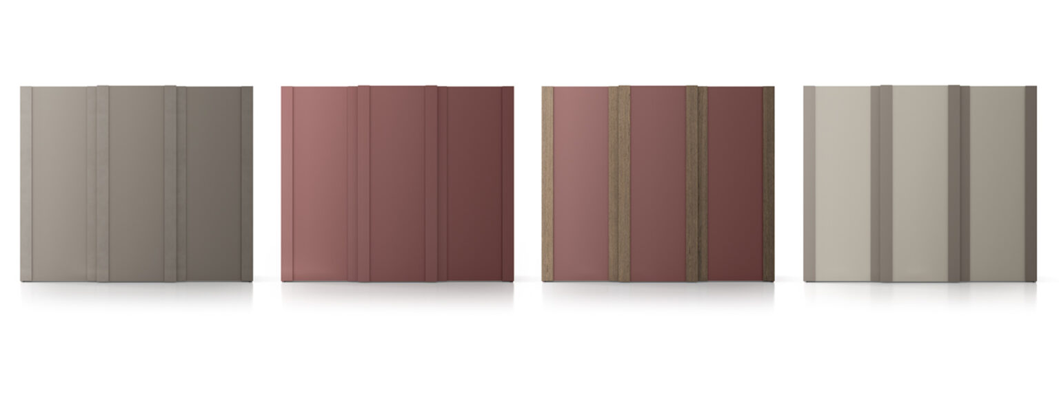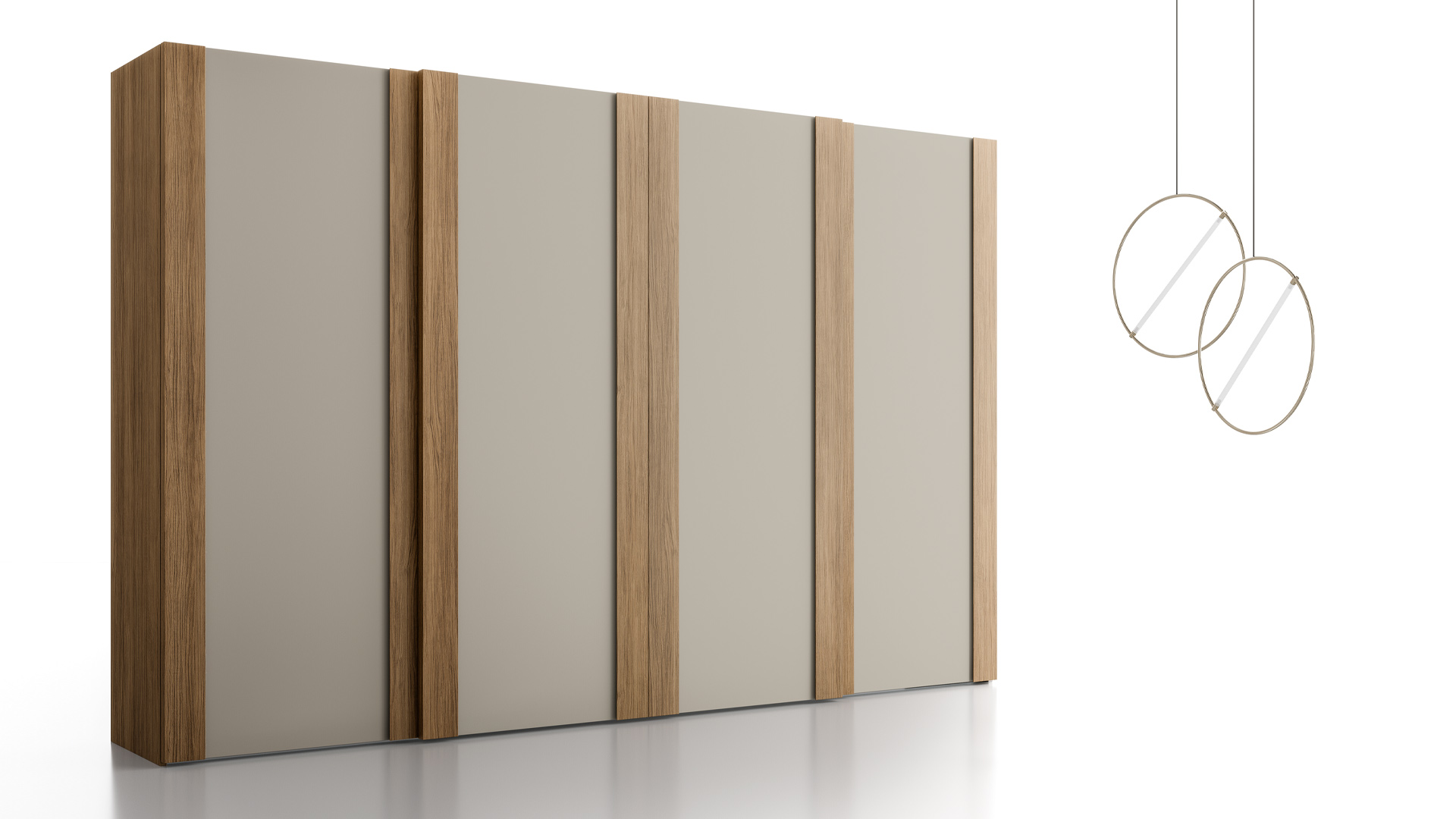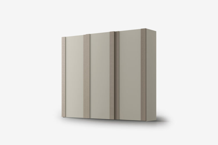 Μια κομψή ντουλάπα με συρόμενες πόρτες που διαθέτει κάθετο πάνελ που μπορεί να εξατομικευτεί σε διαφορετικά φινιρίσματα.