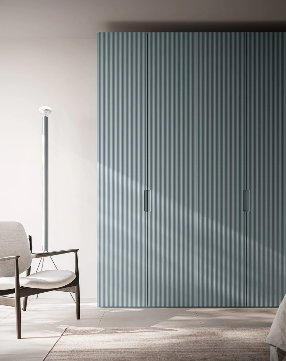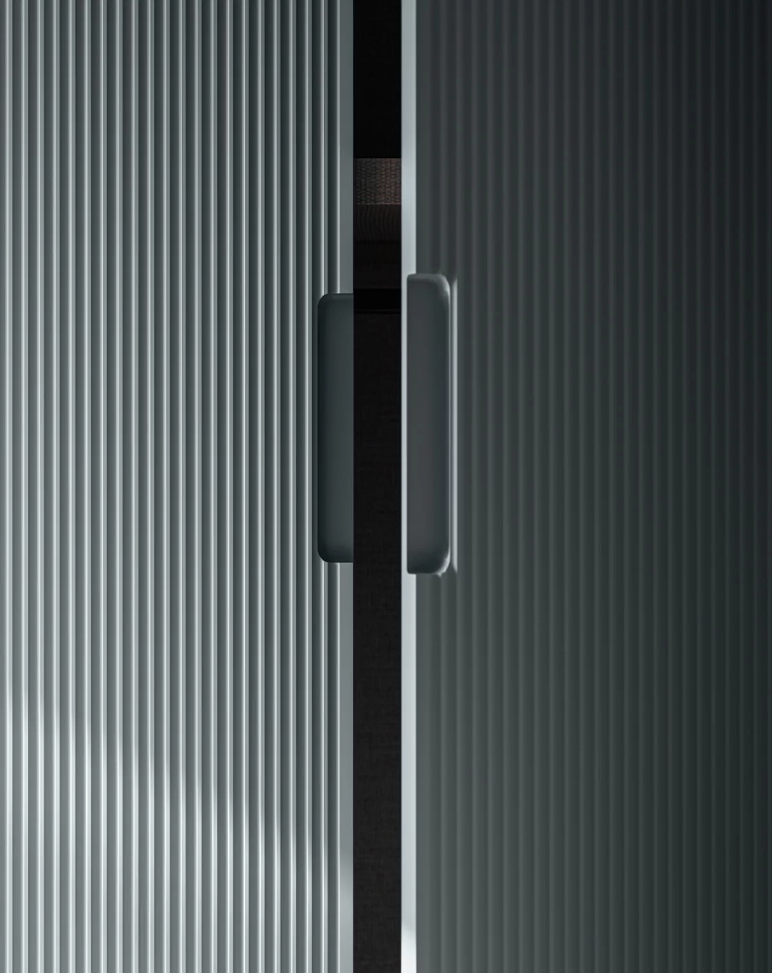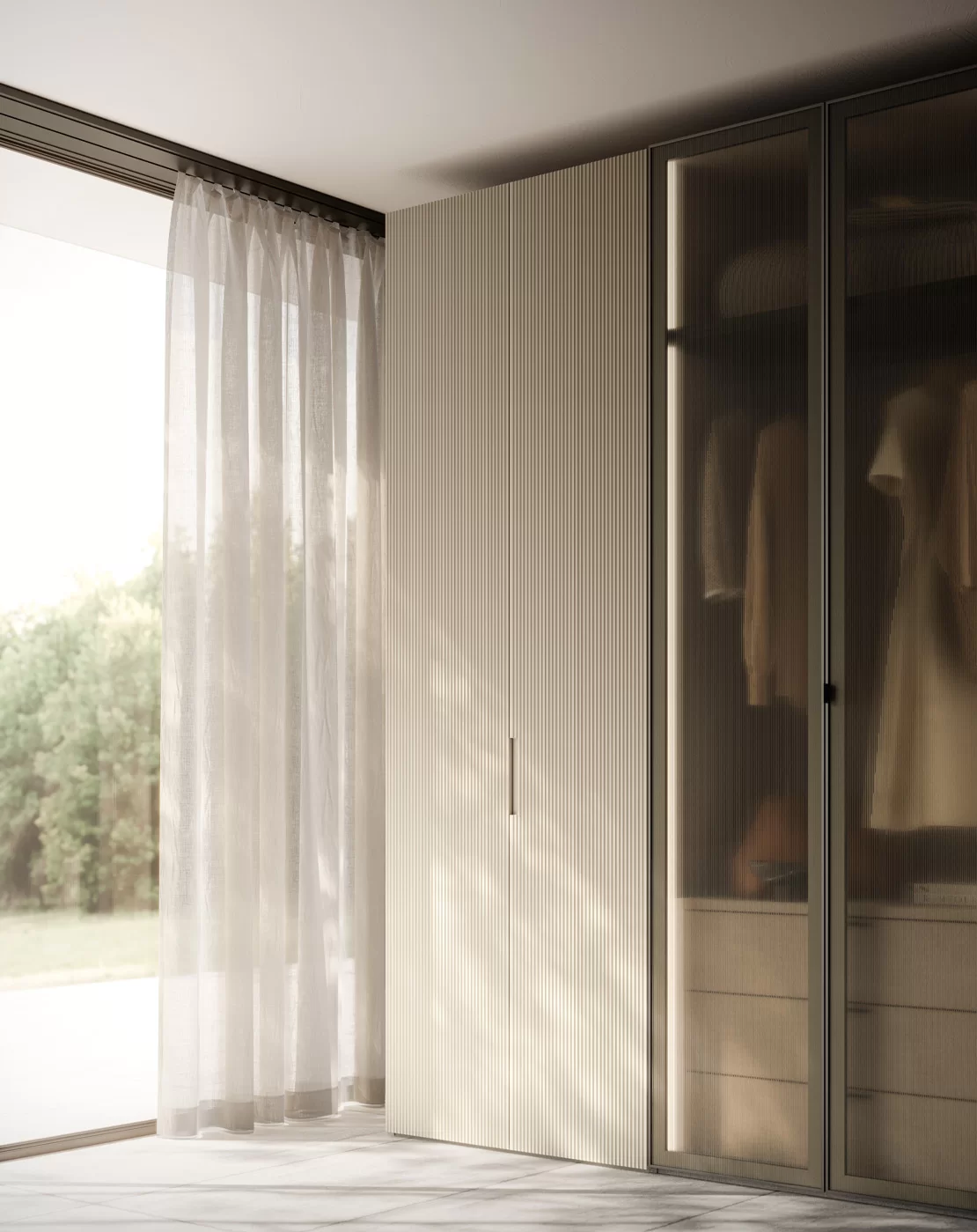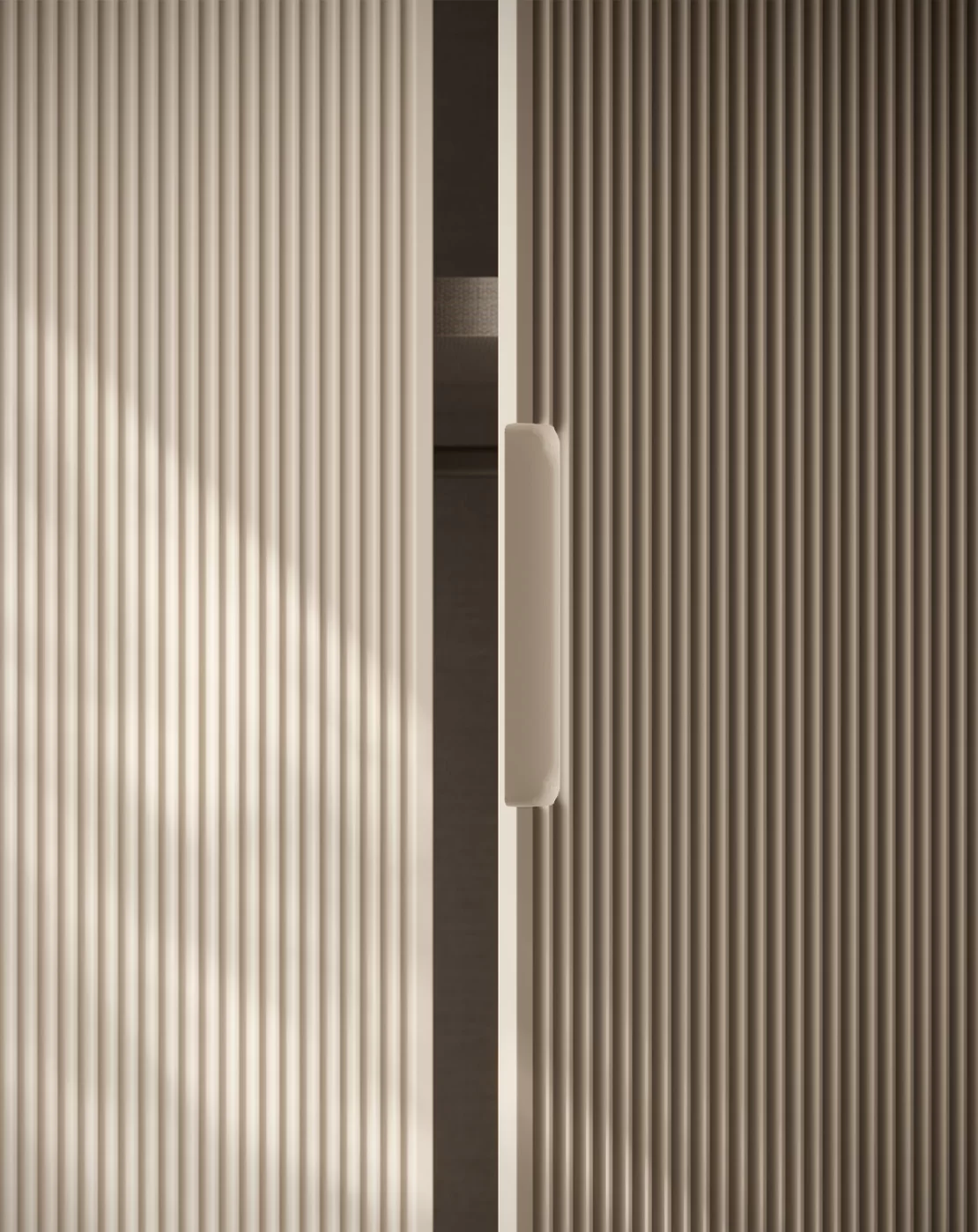 Η πόρτα Grecata μπορεί να συνδυαστεί με την πόρτα Nocta σε ριγωτό γυαλί, προσφέροντας ένα πιο «ανάλαφρο» αισθητικό αποτέλεσμα, ιδιαίτερα σε μεγάλες ντουλάπες. Το ημιδιάφανο φινίρισμα προσδίδει κομψότητα και βάθος, ενώ επιτρέπει με διακριτικό τρόπο την οπτική επαφή με το εσωτερικό.