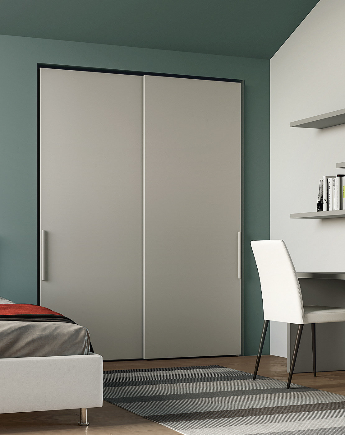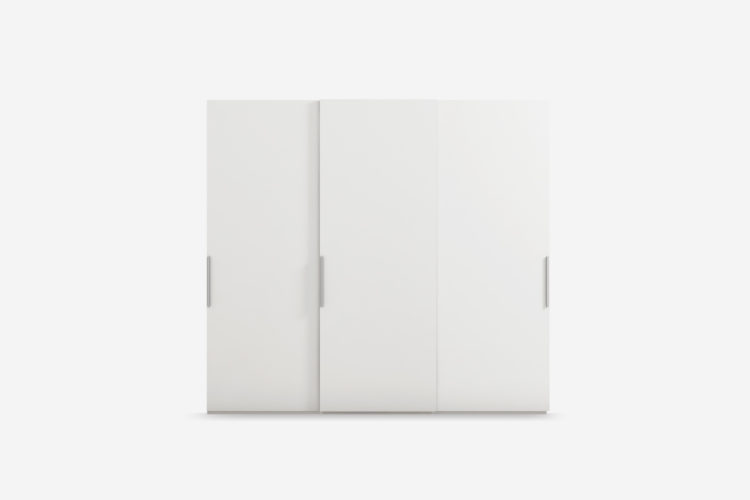 Αυτή η συρόμενη ντουλάπα με δύο ή τρεις πόρτες έχει μινιμαλιστική εμφάνιση και πρακτικά χερούλια, κάνοντας τις πόρτες να ανοίγουν και να κλείνουν εύκολα.