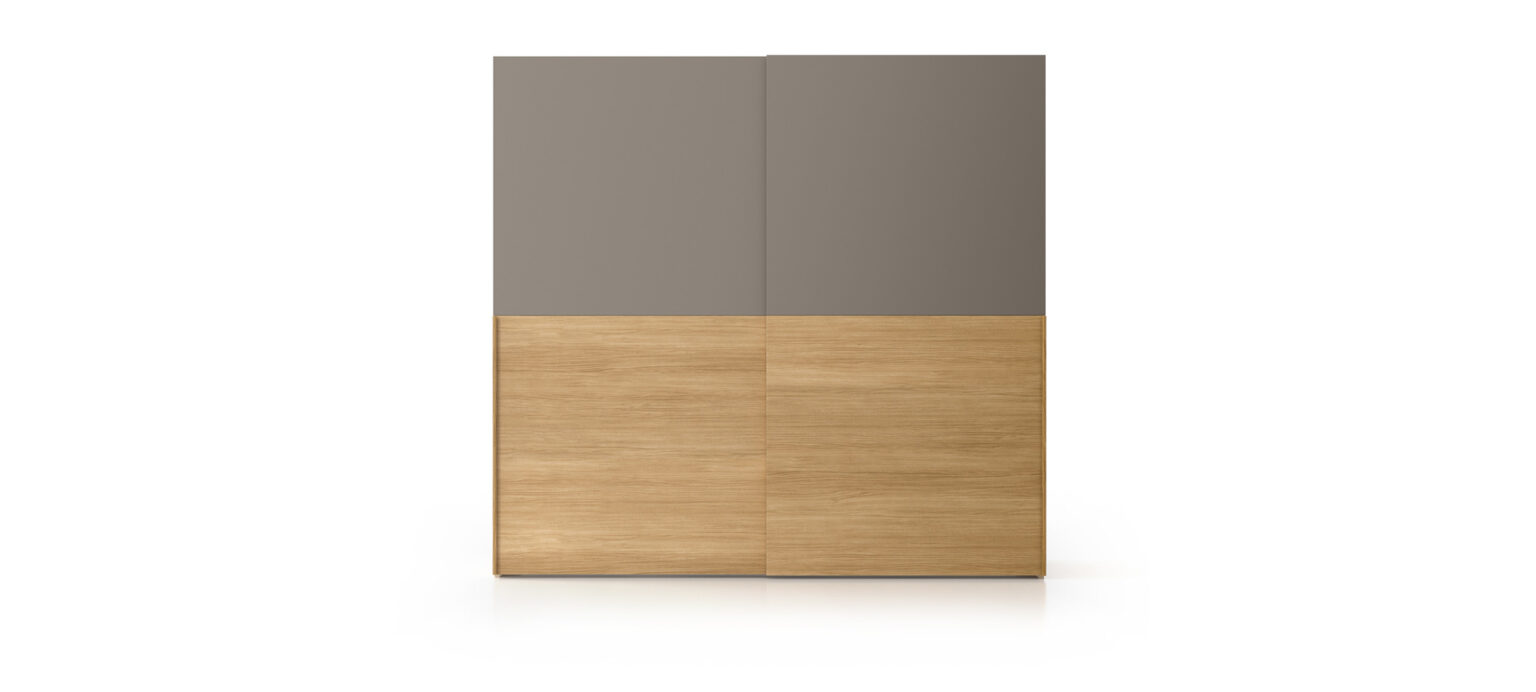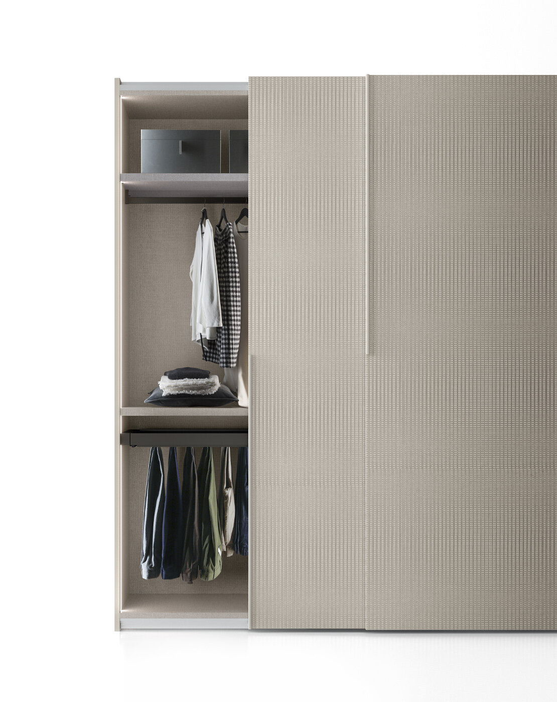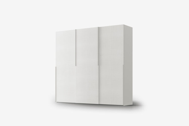 Η ντουλάπα Liscia με συρόμενη πόρτα μπορεί να διακοσμηθεί με το ανάγλυφο φινίρισμα Tissù. Αυτό το γεωμετρικό μοτίβο προσθέτει κίνηση και δίνει στην επιφάνεια μια τρίτη διάσταση.