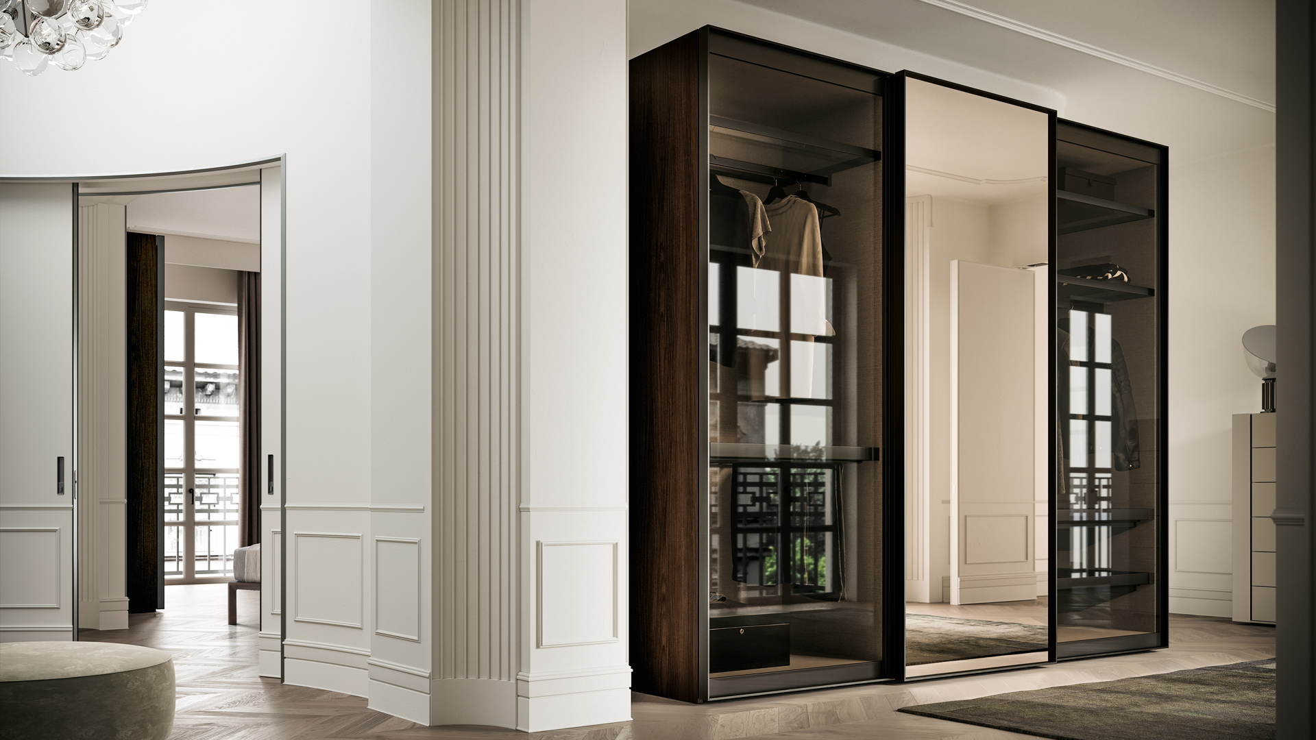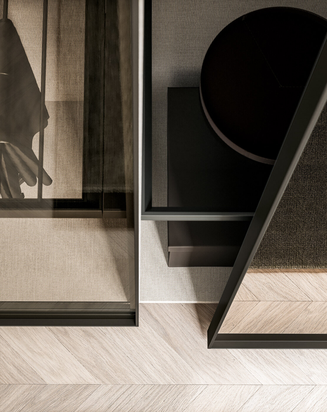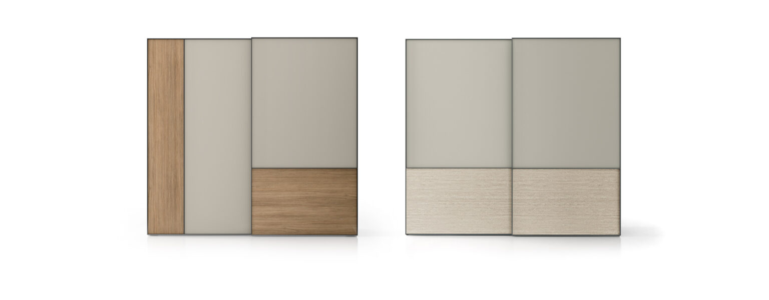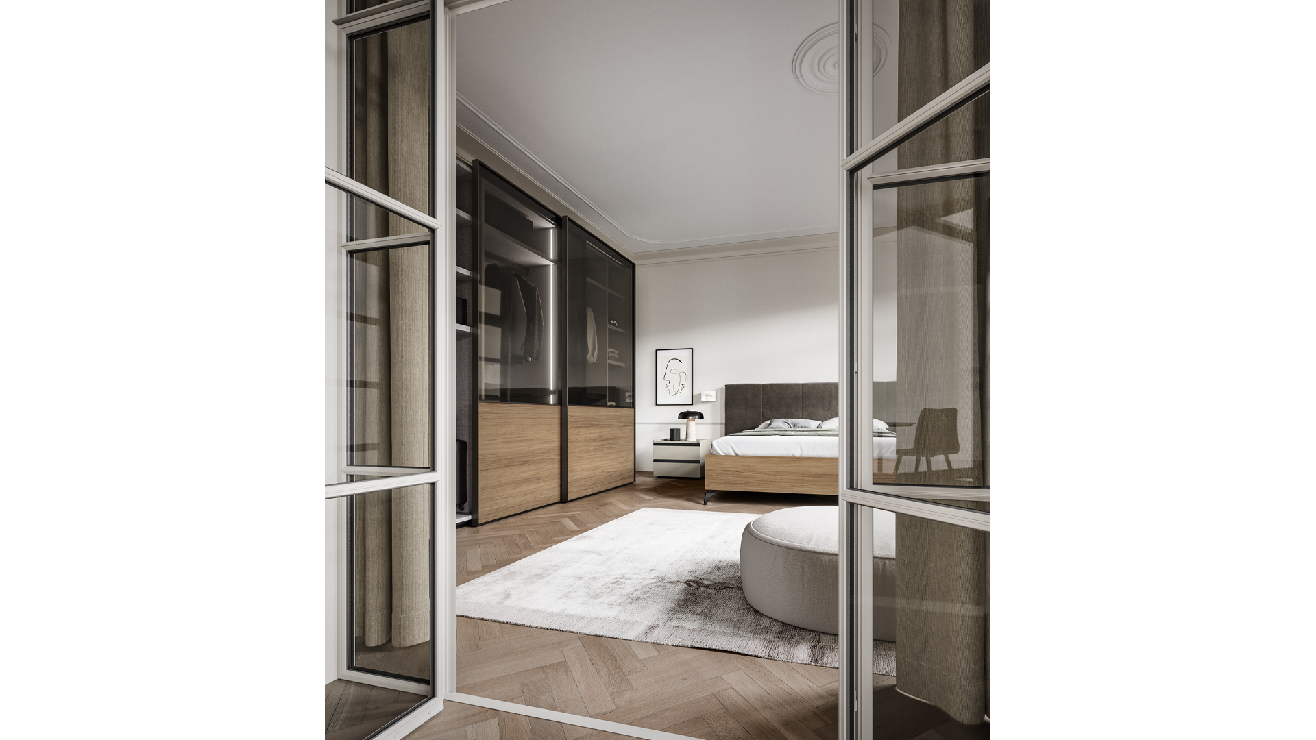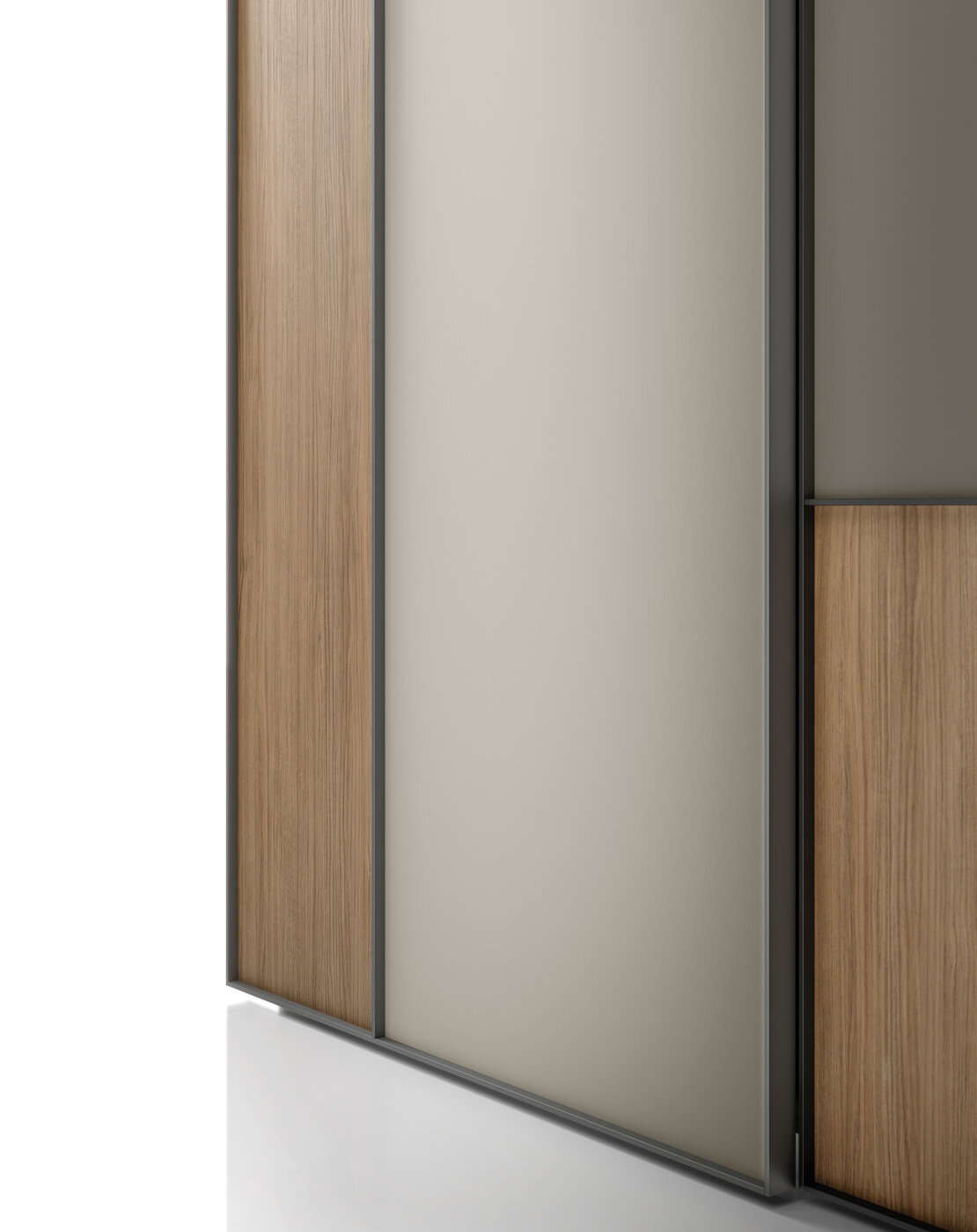 Η συρόμενη νουτλάπα Nuit αποτελεί μοναδικό μινιμαλιστικό προϊόν έμπνευσης συνδιάζοντας ξύλο, αλουμίνιο και τιτάνιο. Η κεντρική πόρτα σε μπρούτζινο καθρέφτη και οι πλαϊνές πόρτες από γυαλί Stopsol εκφράζουν ένα μποέμικο στυλ που ακροβατεί με κομψό τρόπο ανάμεσα στο παραδοσιακό και στο μοντέρνο.