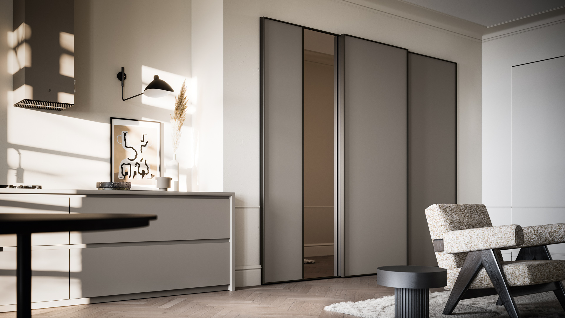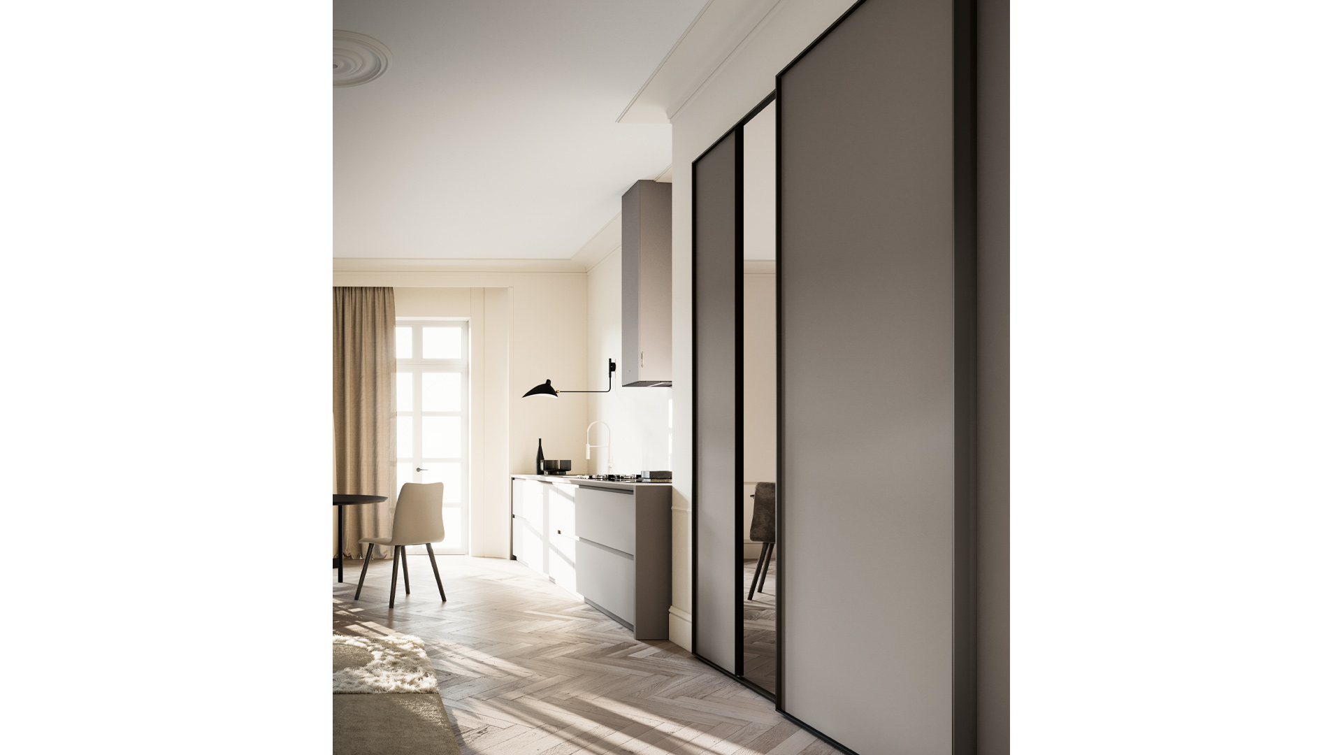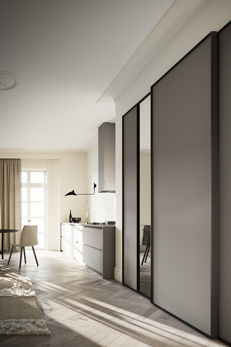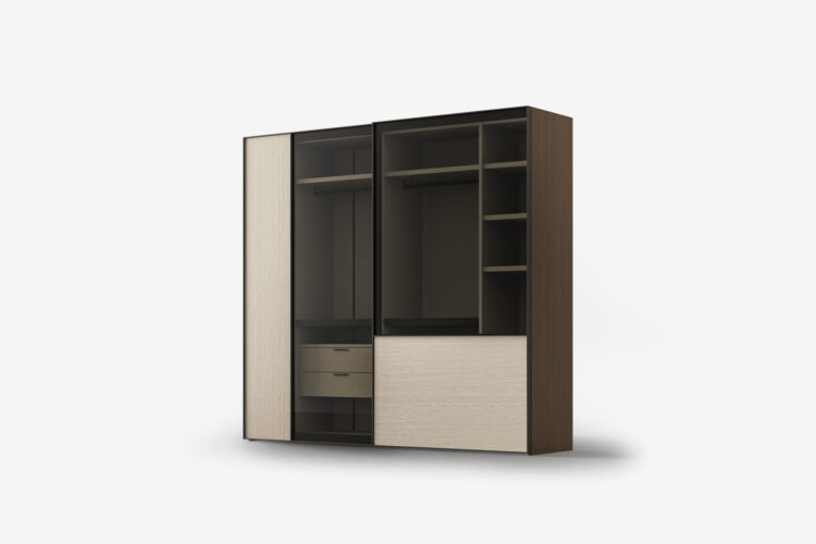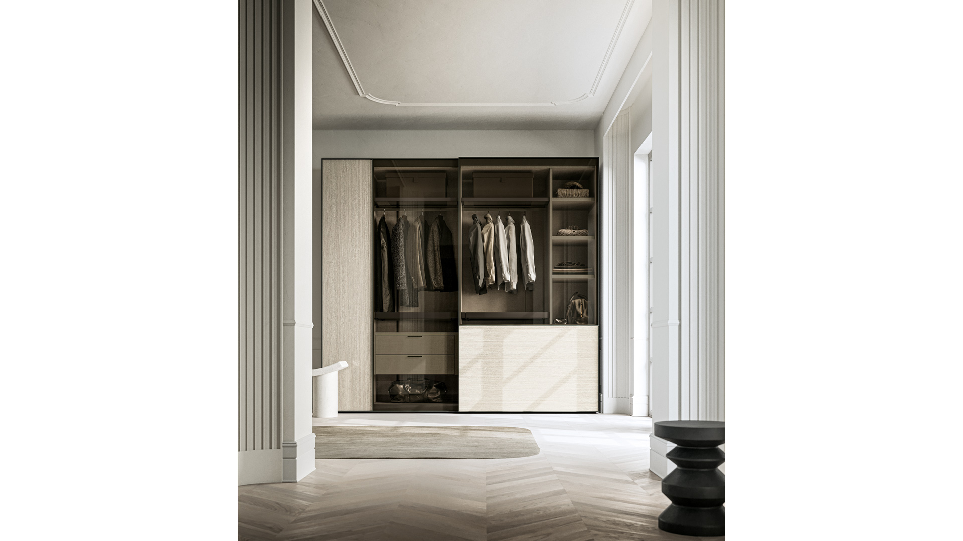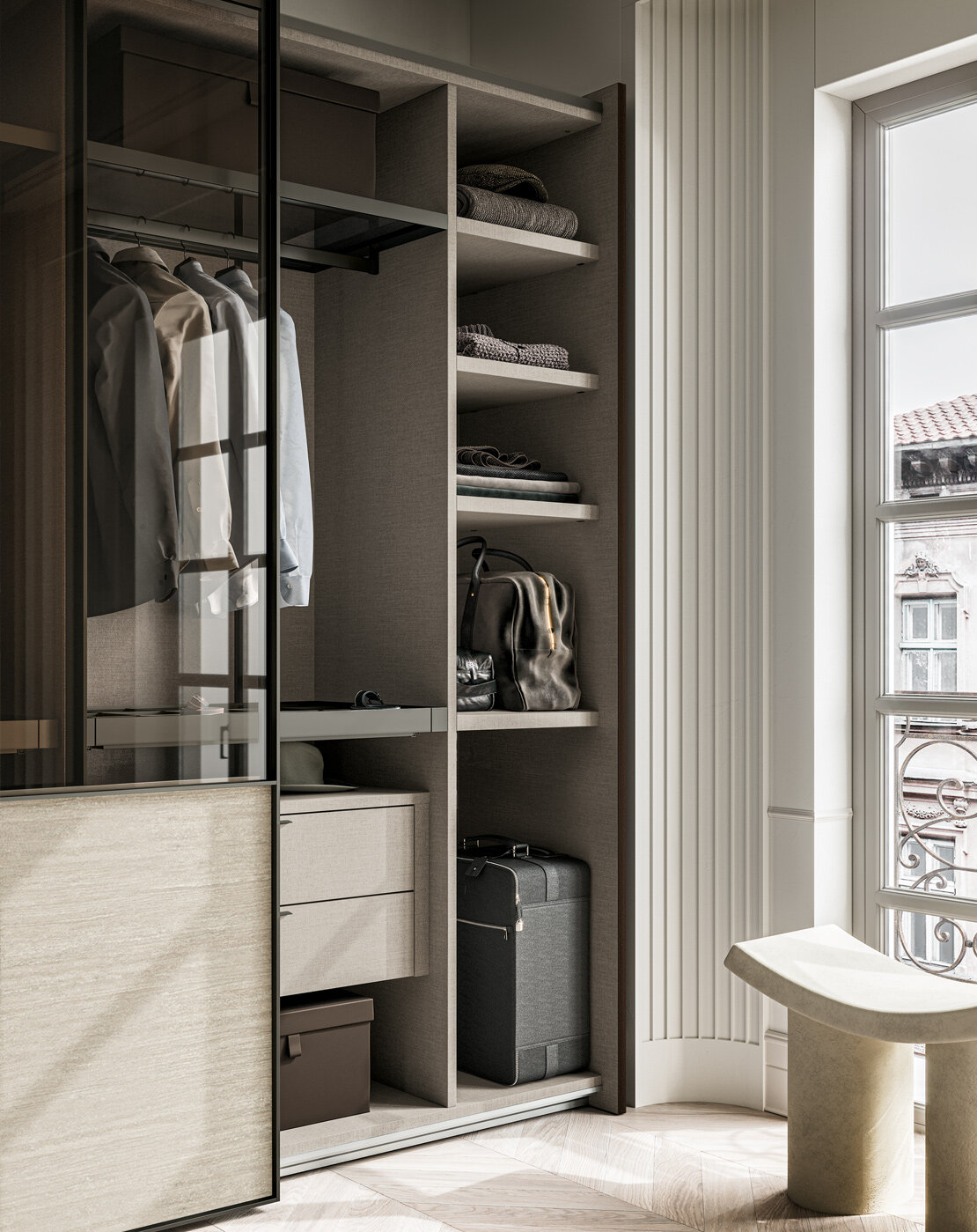 Η συρόμενη νουτλάπα Nuit αποτελεί μοναδικό μινιμαλιστικό προϊόν έμπνευσης συνδιάζοντας ξύλο, αλουμίνιο και τιτάνιο. Η κεντρική πόρτα σε μπρούτζινο καθρέφτη και οι πλαϊνές πόρτες από γυαλί Stopsol εκφράζουν ένα μποέμικο στυλ που ακροβατεί με κομψό τρόπο ανάμεσα στο παραδοσιακό και στο μοντέρνο.