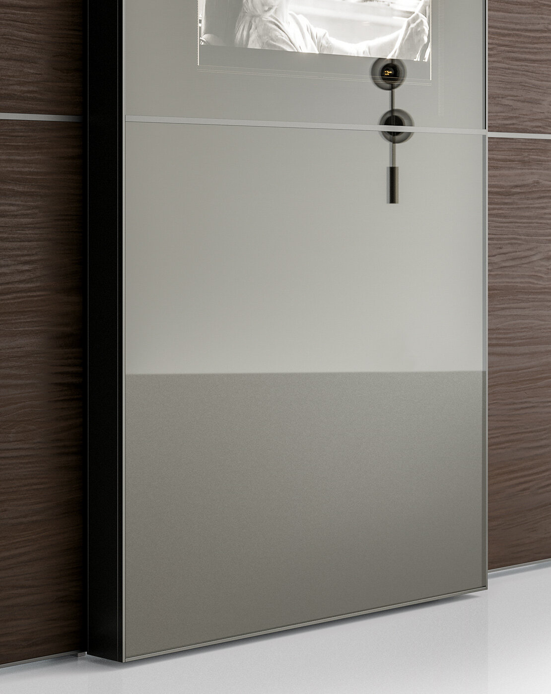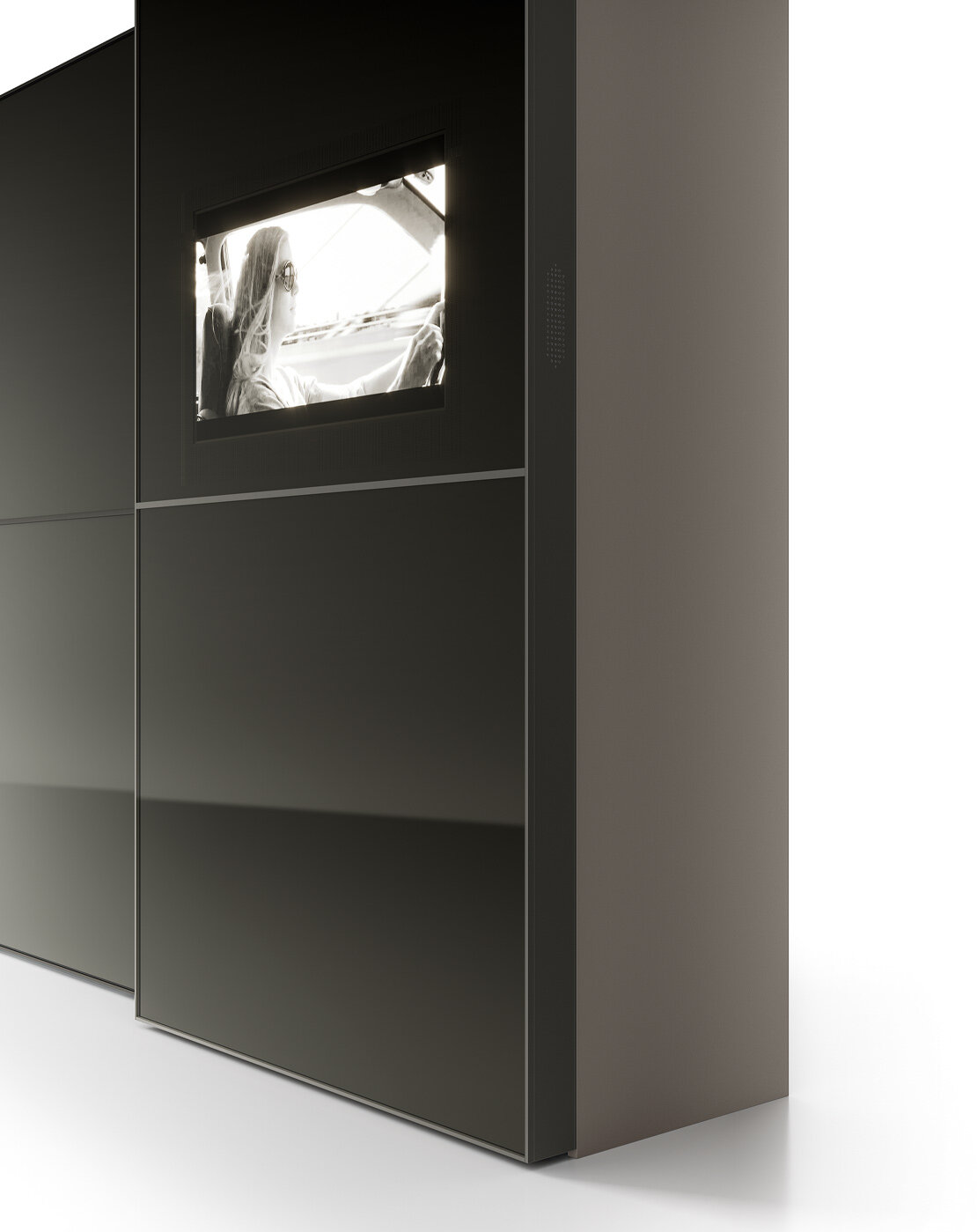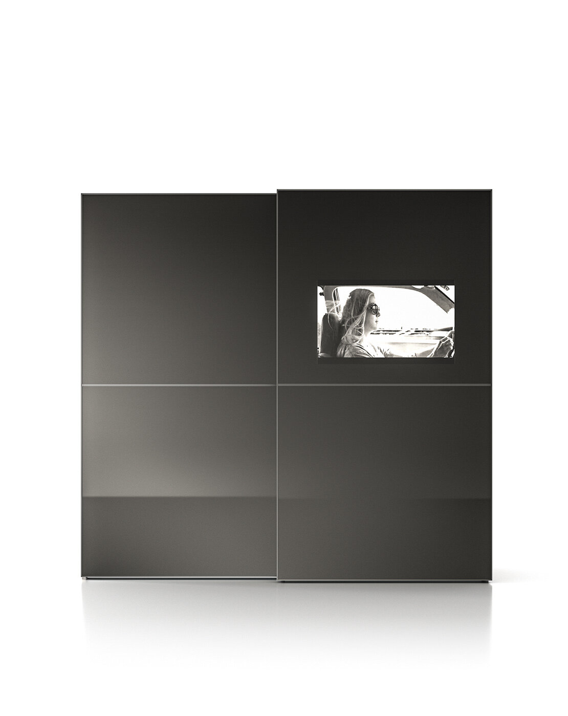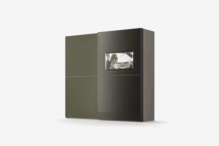 Ντουλάπα με ενσωματωμένη τηλεόραση στη γυάλινη πόρτα Stopsol πάχους 122 mm. Η οθόνη είναι ενσωματωμένη στην πόρτα και φαίνεται μόνο όταν είναι ενεργοποιημένη. Επιπλέον δεν χρειάζεται να ανοίξετε την ντουλάπα για να παρακολουθήσετε τηλεόραση, η οποία όταν είναι σβηστή, είναι εντελώς αόρατη και η επιφάνεια είναι λεία.