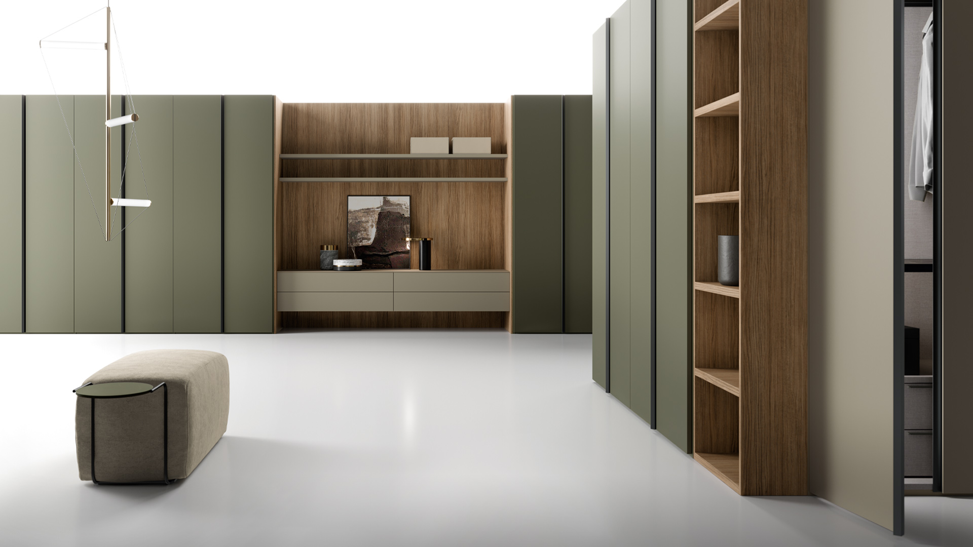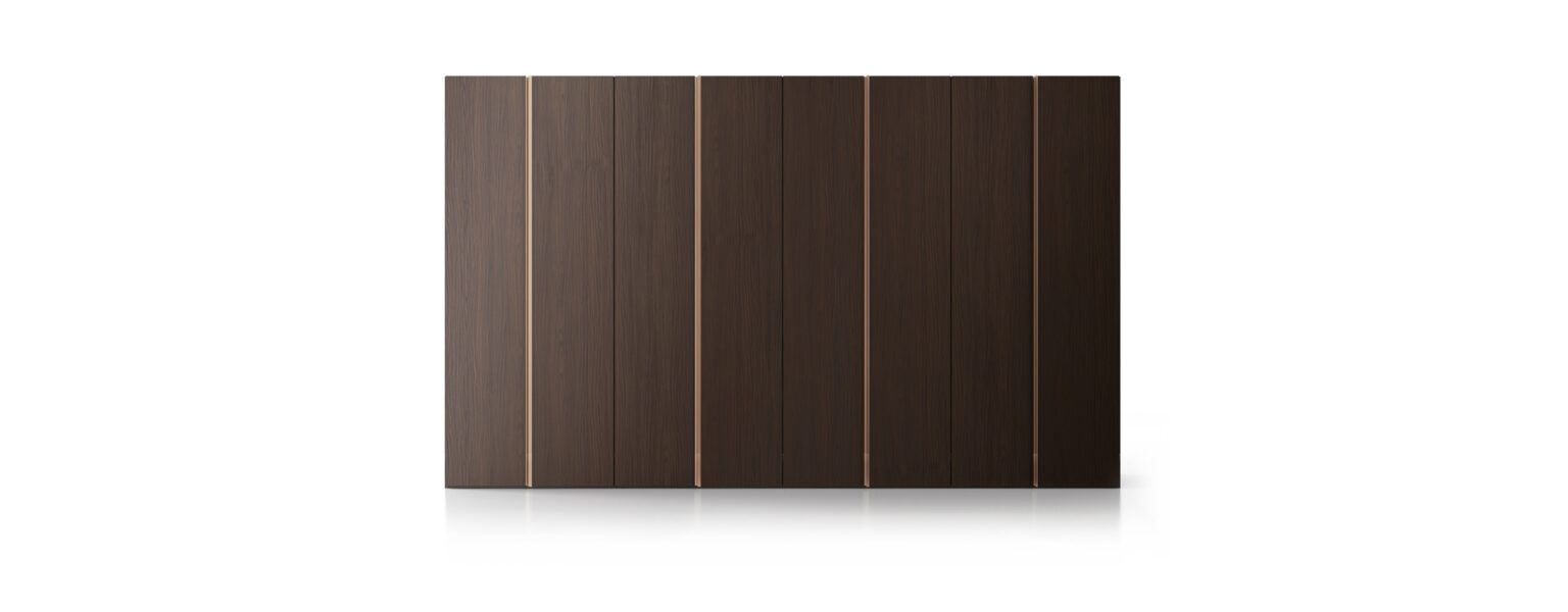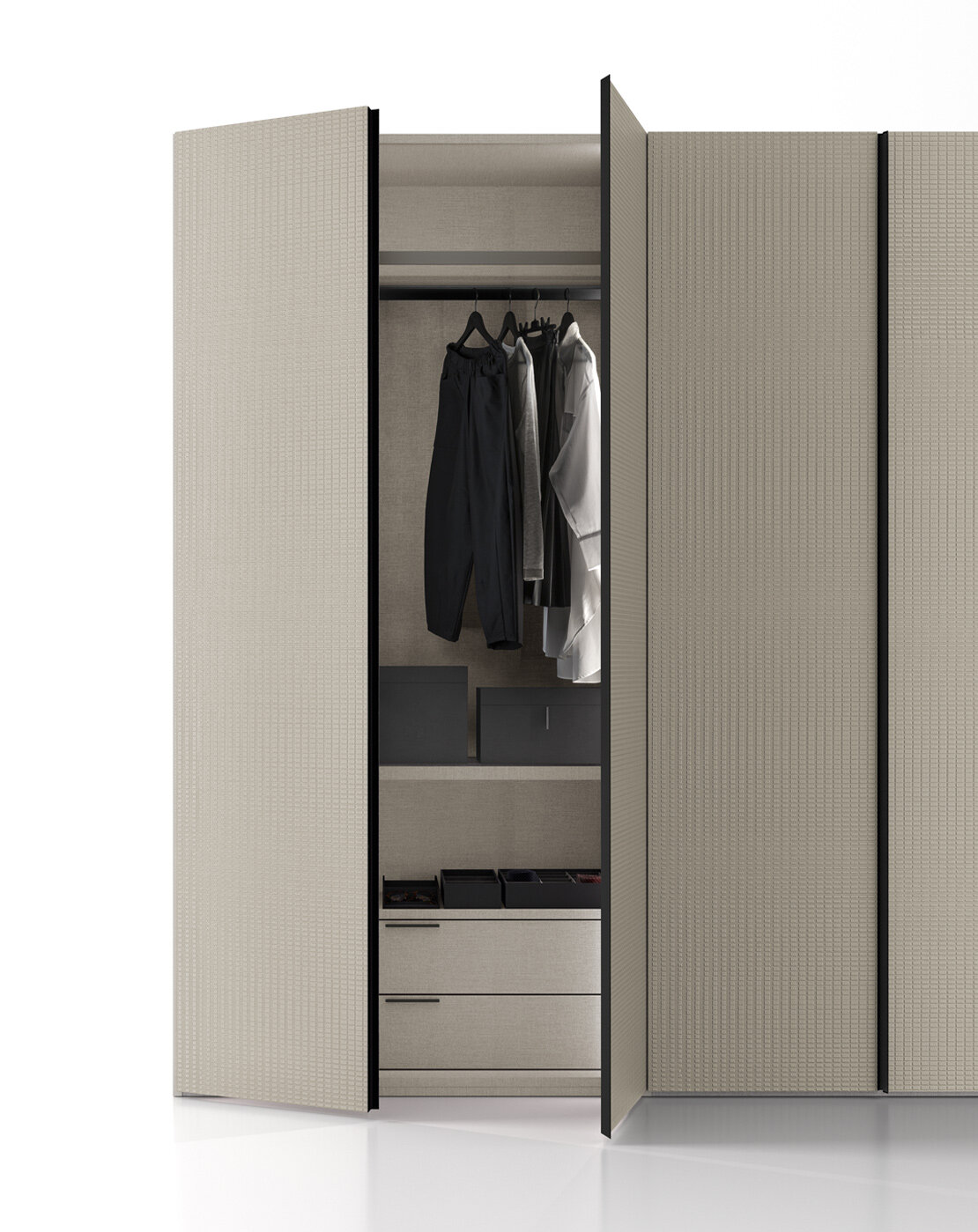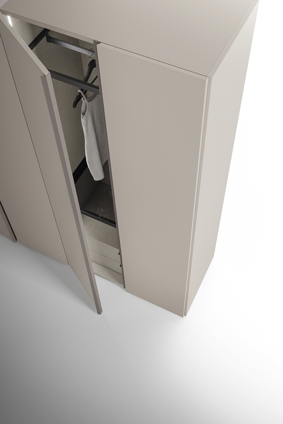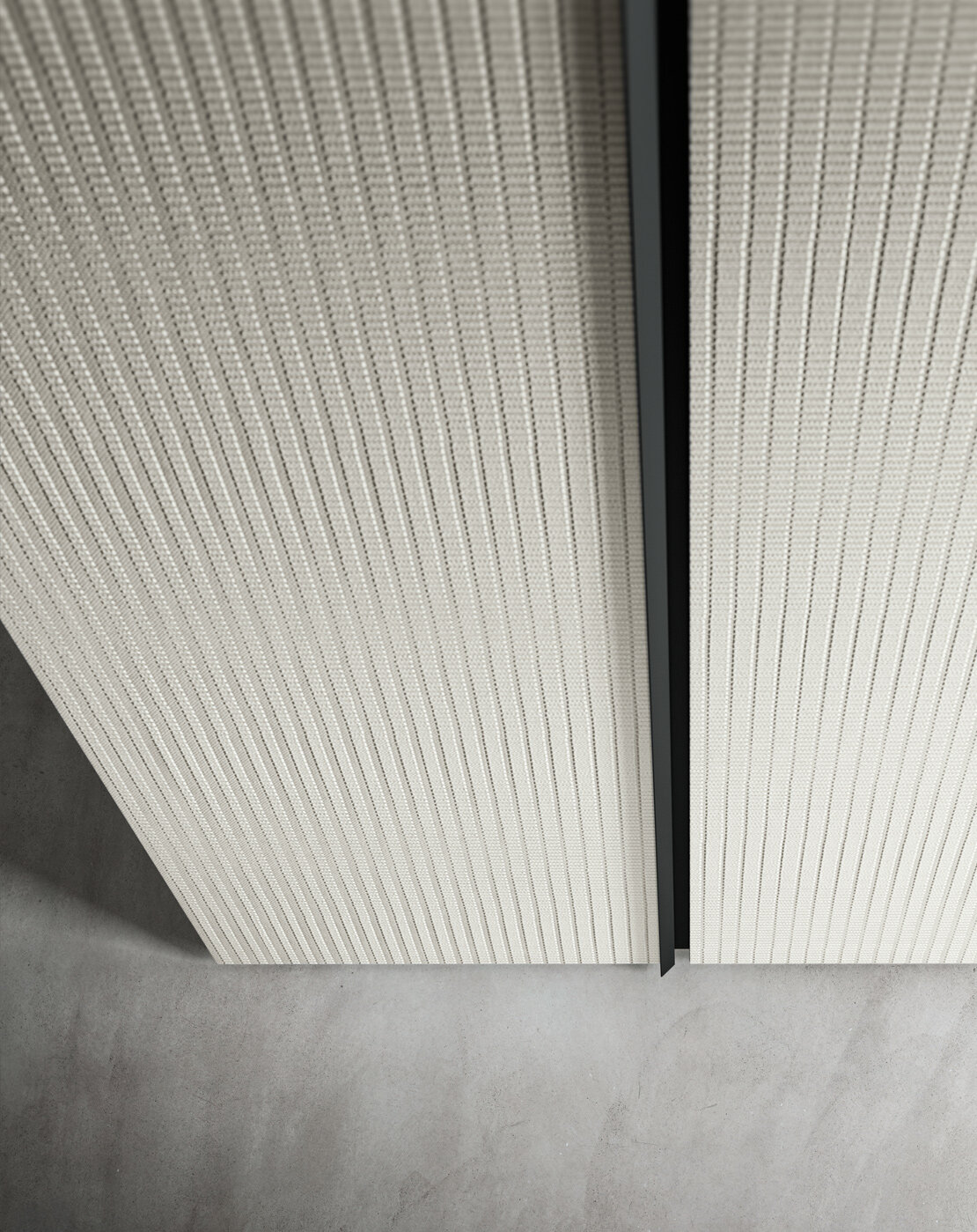 Η λαβή στην πόρτα της ντουλάπας Tandem διαθέτει διπλό μεταλλικό προφίλ που ”τρέχει” κάθετα πάνω στις δύο πόρτες. Αυτό που κάνει αυτή τη σύνθεση ντουλάπας μοναδική είναι το 3D εφέ που δημιουργείται από το ένα προφίλ που προεξέχει ως χειρολαβή ενώ το άλλο είναι λαξευμένο προς τα μέσα στο υπό γωνία βάθος της πόρτας.