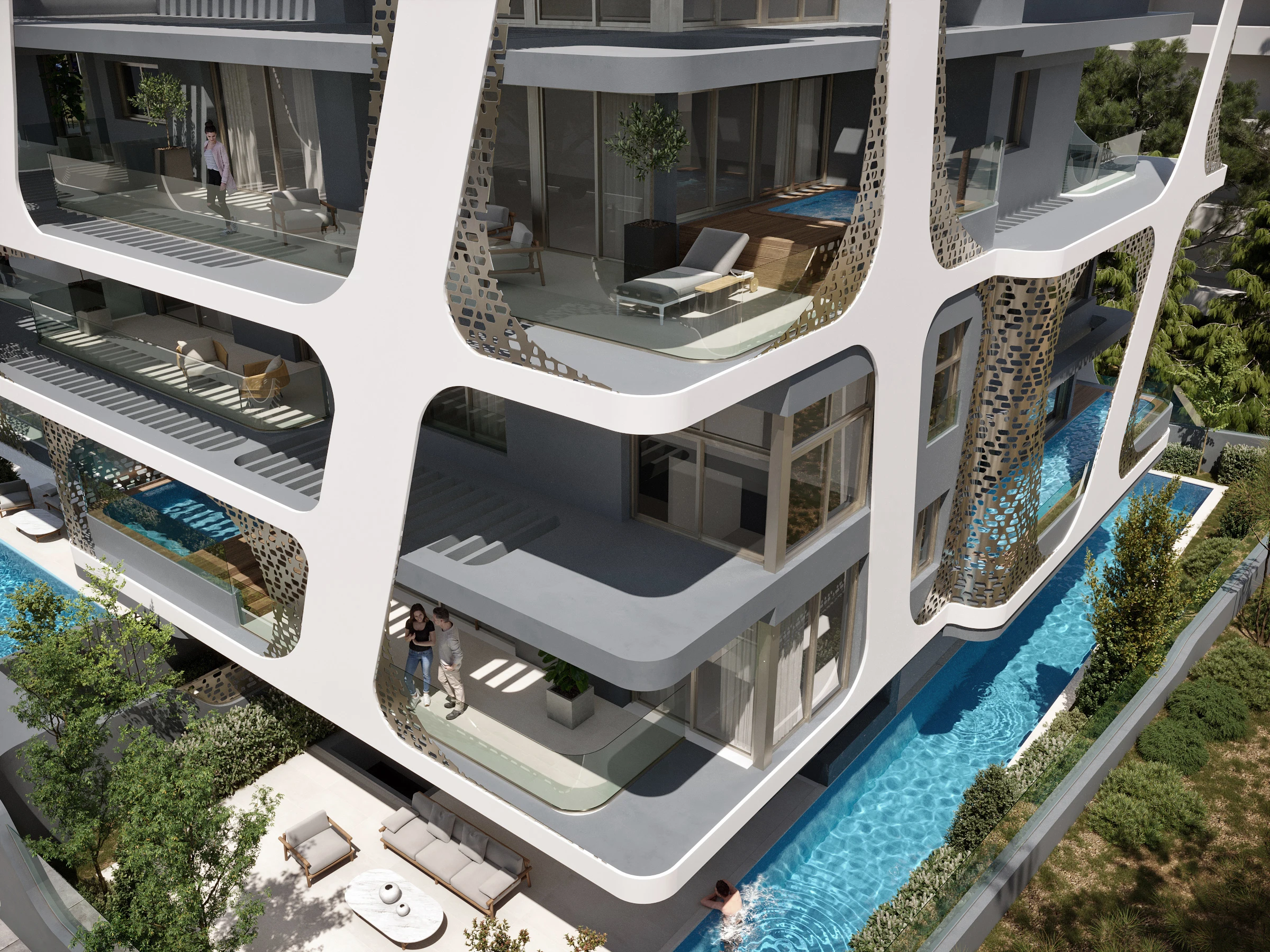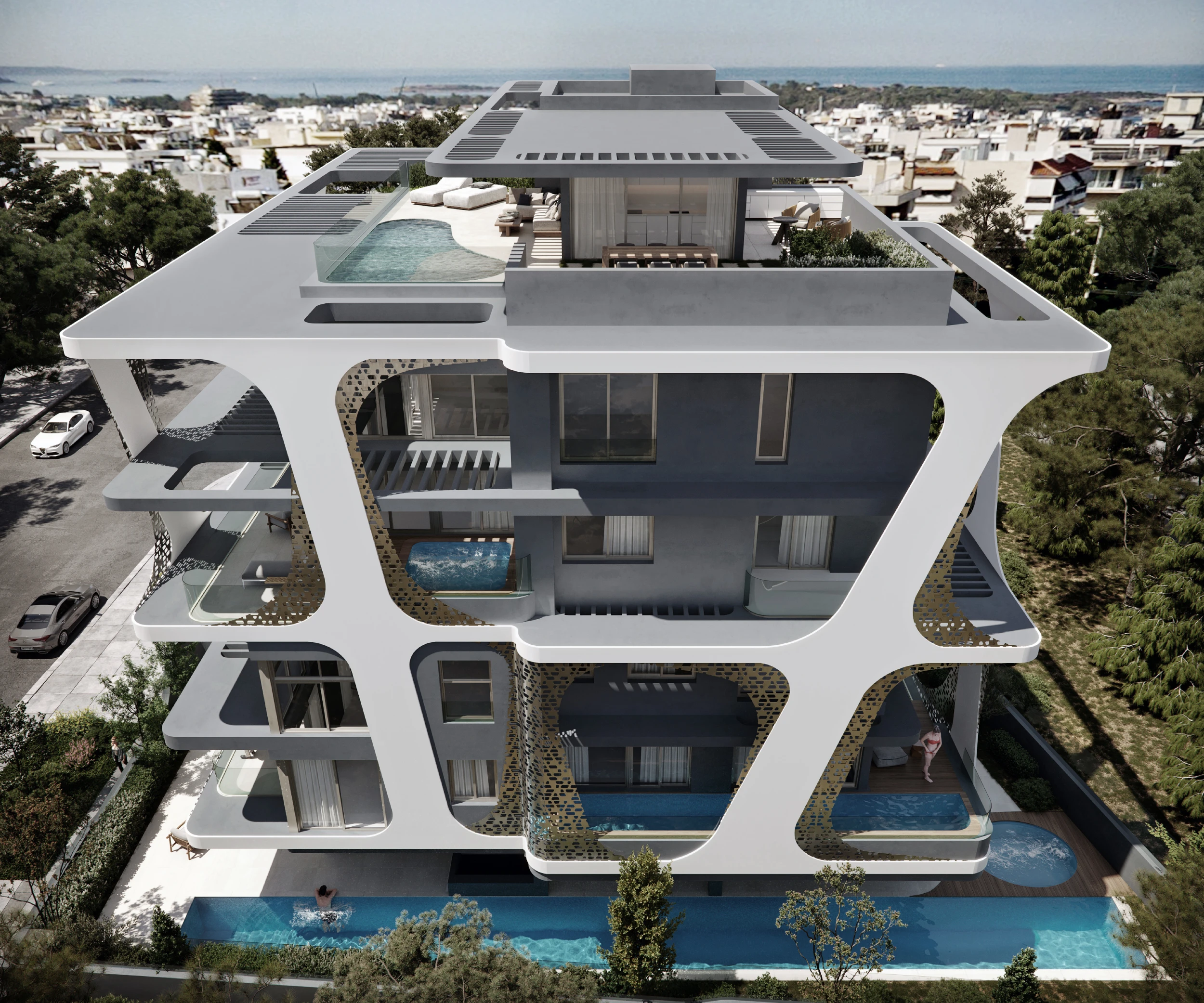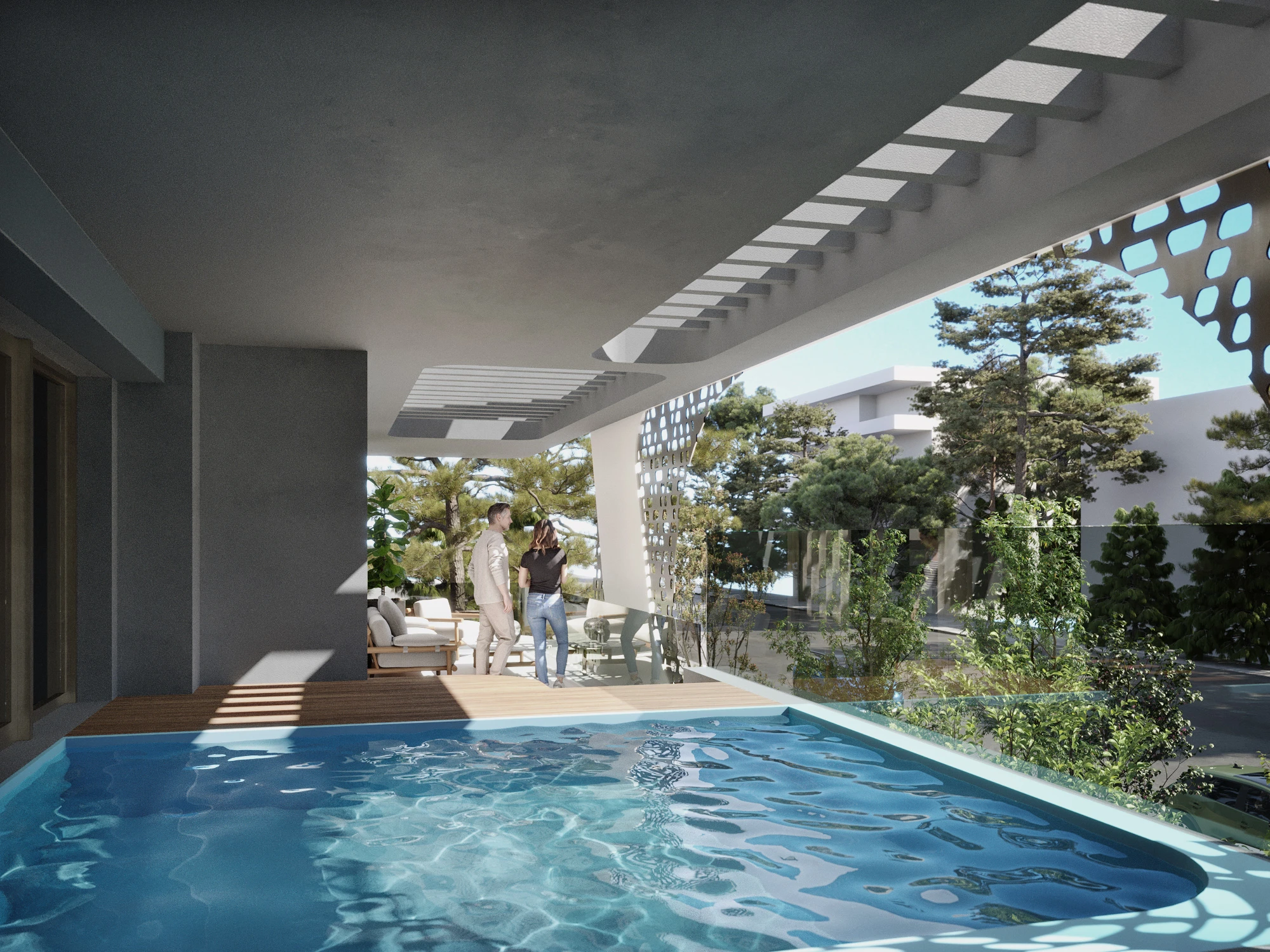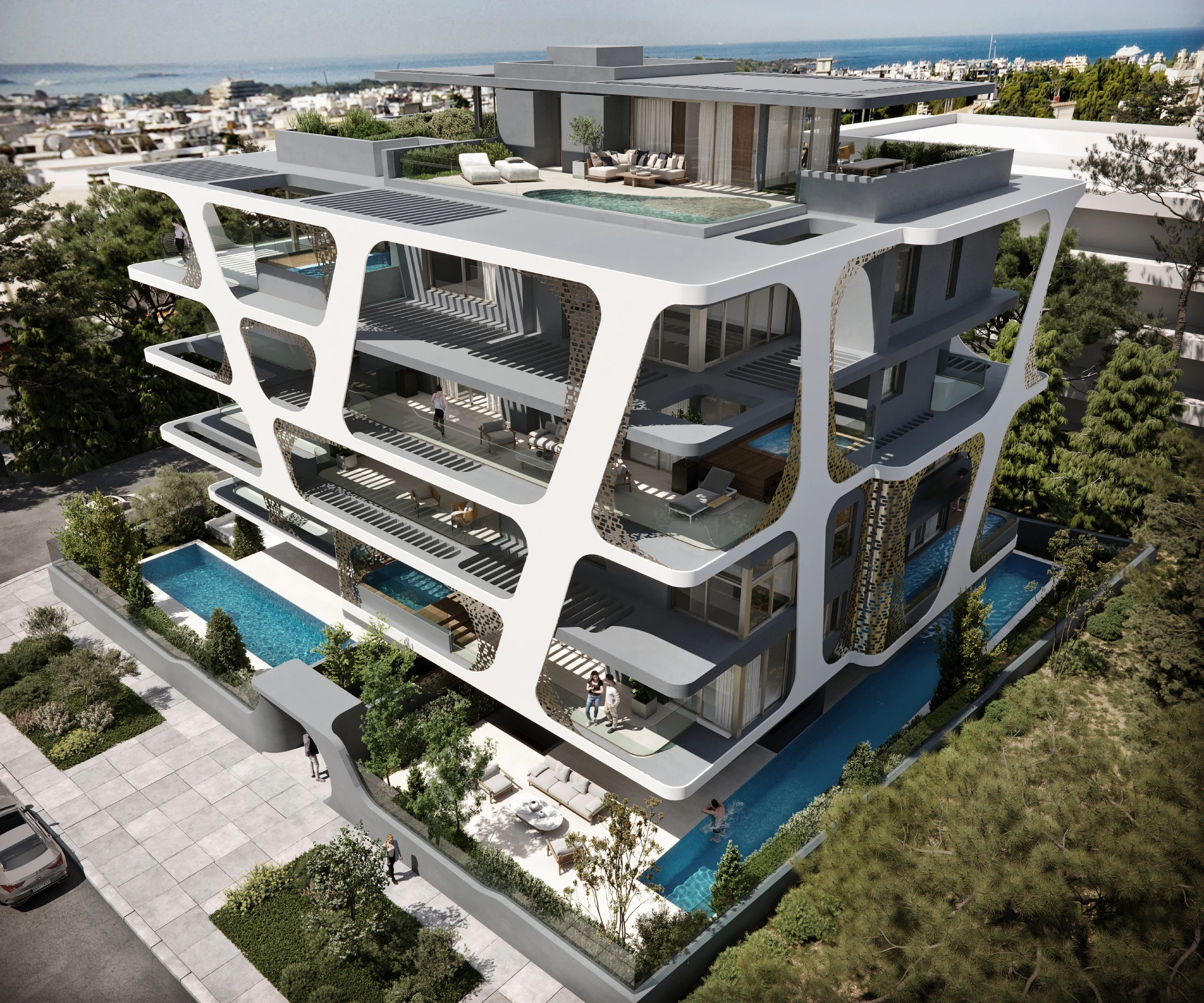 Το έργο περιλαμβάνει οροφοδιαμερίσματα υψηλής αισθητικής, όλα με ιδιωτικές πισίνες και πολλαπλές θέσεις στάθμευσης, ενώ η αρχιτεκτονική σύνθεση στοχεύει στη συμβίωση μορφής και λειτουργικότητας. Οι κατοικίες διαθέτουν ευρύχωρους εξωτερικούς χώρους, υψηλά standards κατασκευής και εντυπωσιακό αίθριο αμέσως μετά την είσοδο, προσφέροντας αίσθηση αποκλειστικότητας.