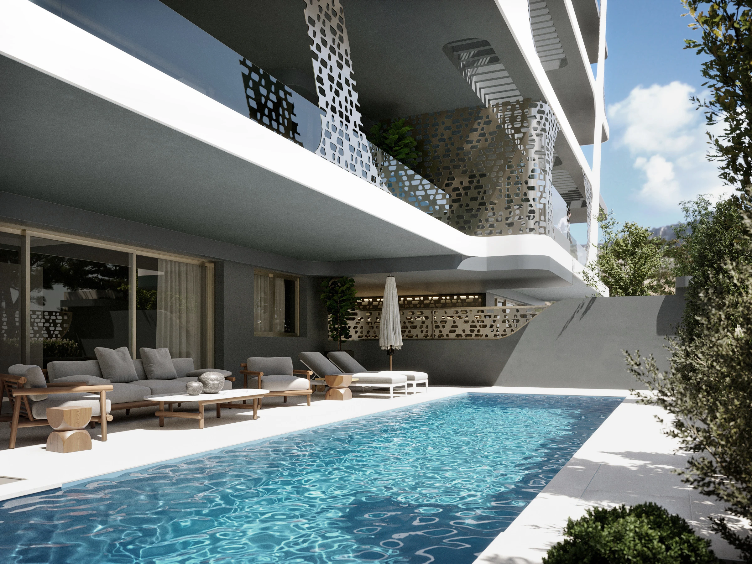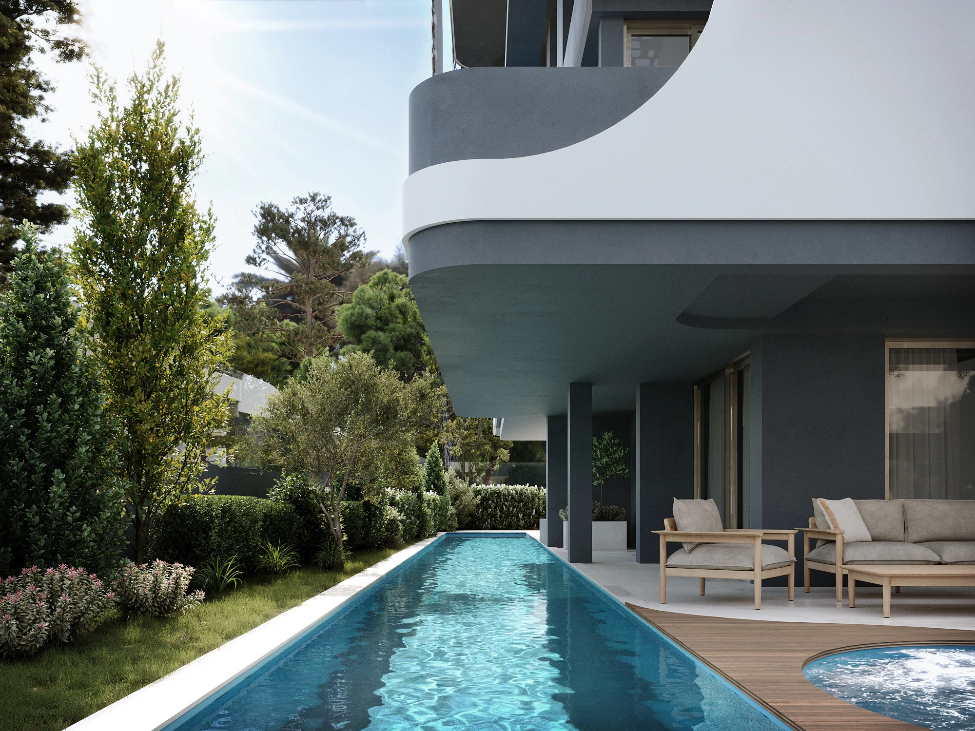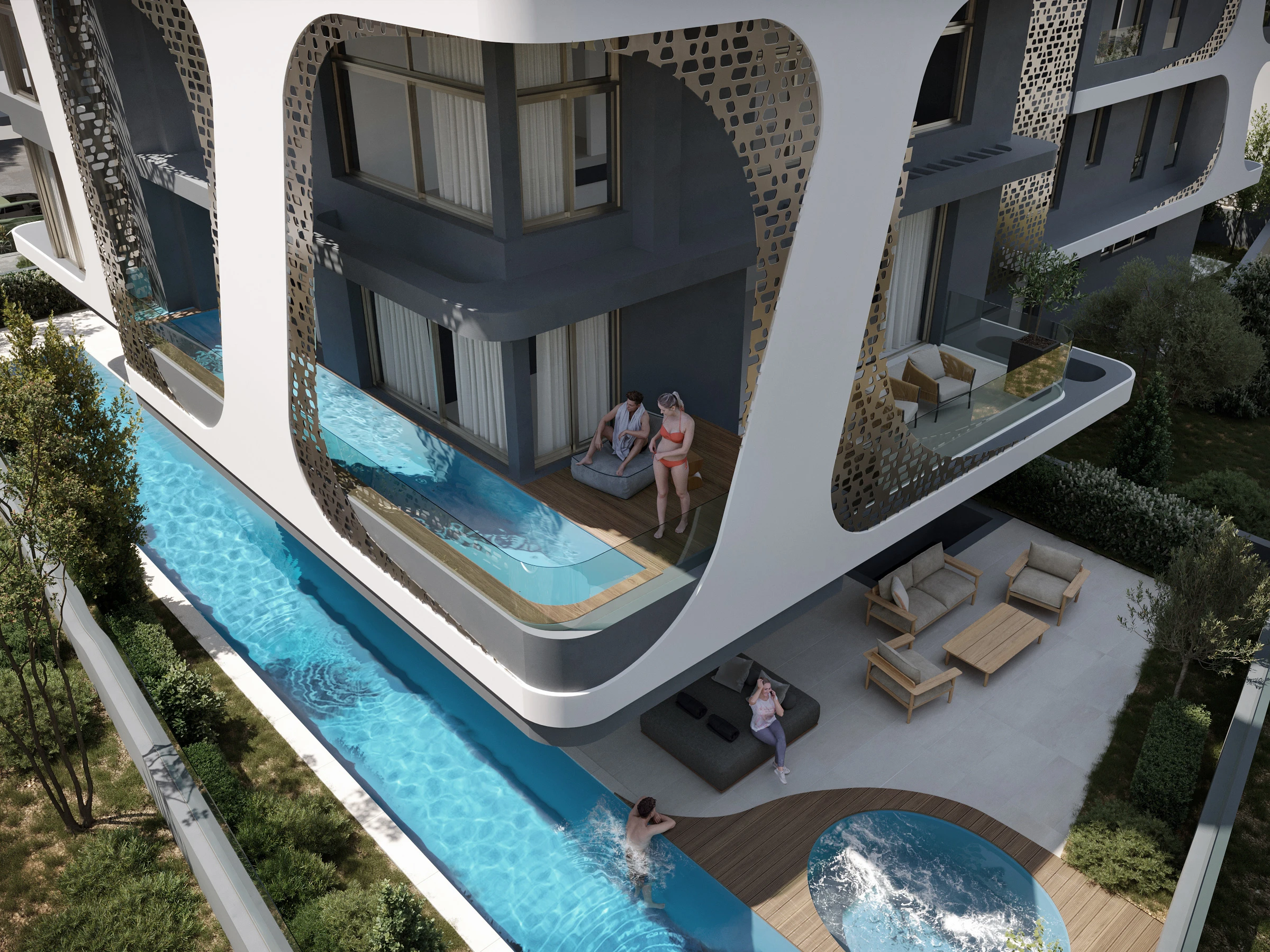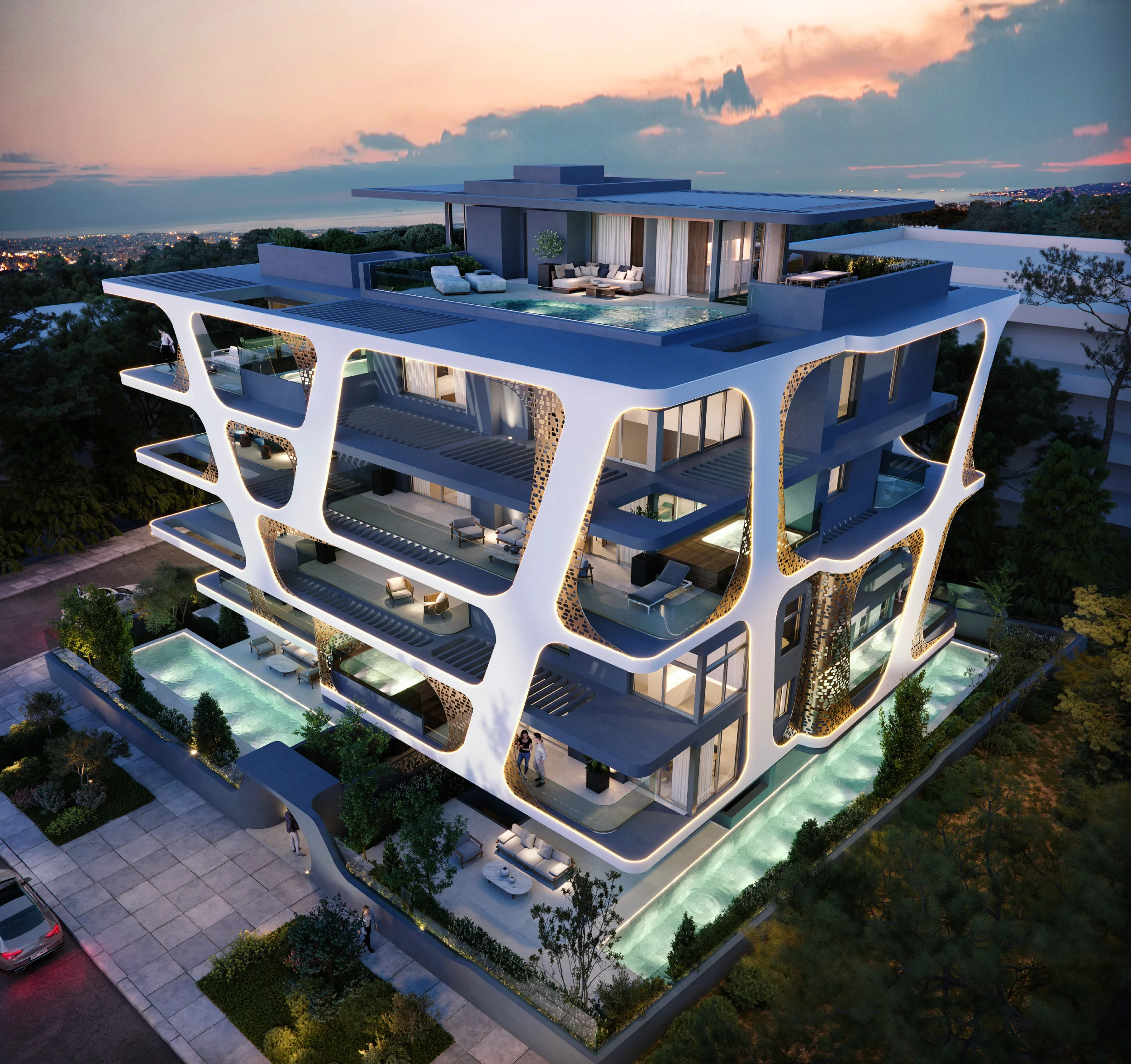 Το έργο περιλαμβάνει οροφοδιαμερίσματα υψηλής αισθητικής, όλα με ιδιωτικές πισίνες και πολλαπλές θέσεις στάθμευσης, ενώ η αρχιτεκτονική σύνθεση στοχεύει στη συμβίωση μορφής και λειτουργικότητας. Οι κατοικίες διαθέτουν ευρύχωρους εξωτερικούς χώρους, υψηλά standards κατασκευής και εντυπωσιακό αίθριο αμέσως μετά την είσοδο, προσφέροντας αίσθηση αποκλειστικότητας.